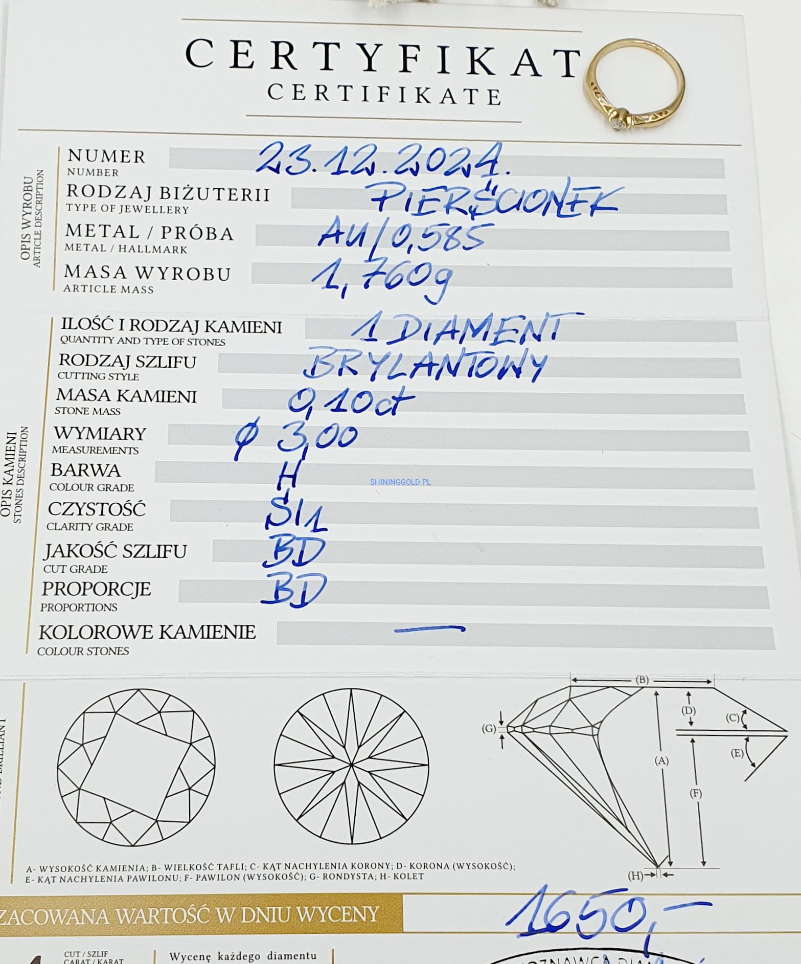 - 1 diament o masie 0,10 ct, czystość SI1, barwa H