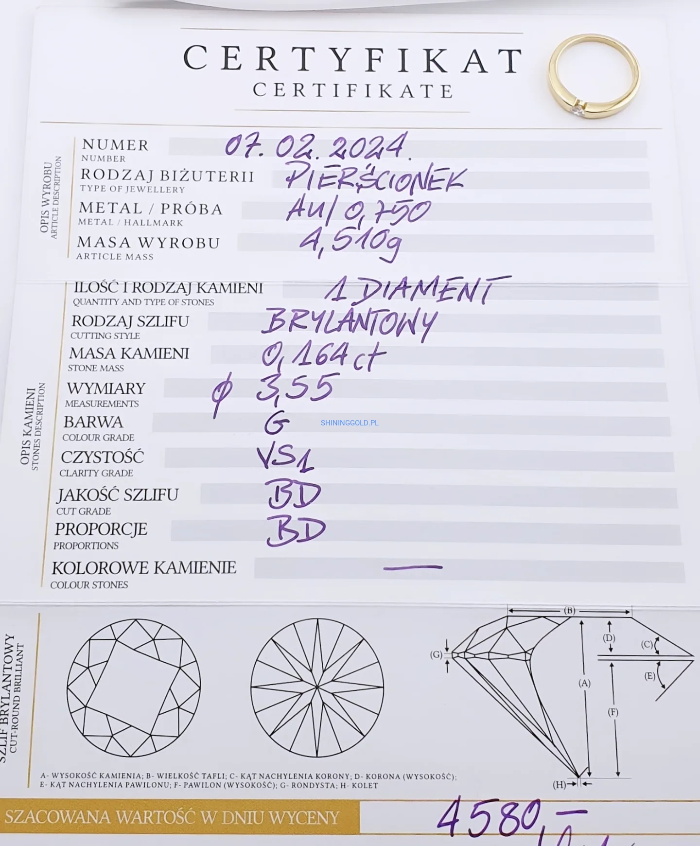 Certyfikat autentyczności kamienia i wybity znak próby