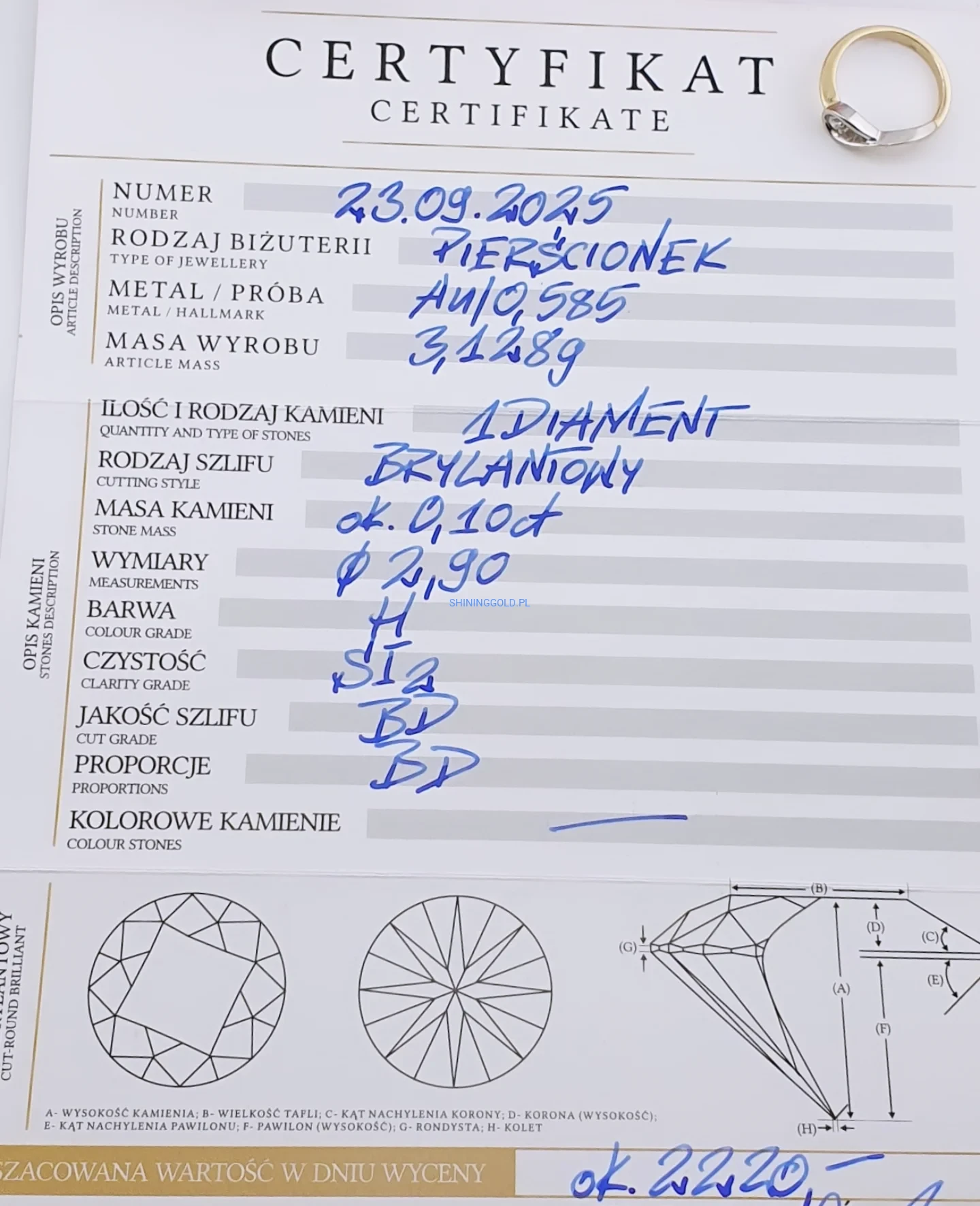 Złoty pierścionek z diamentem (1092WS)
