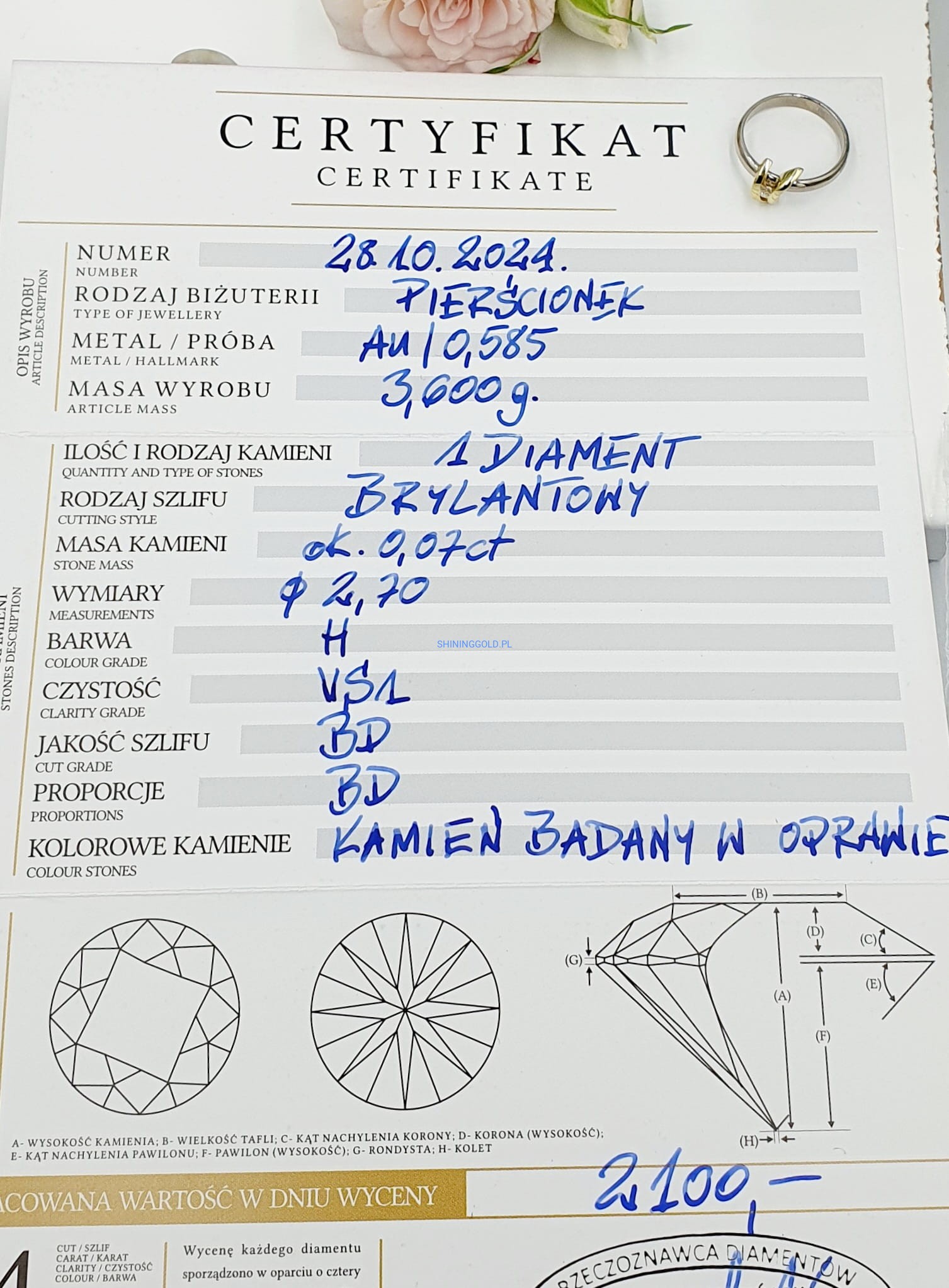 Ten elegancki złoty pierścionek ozdobiony jest diamentem o wyjątkowej czystości i pięknej barwie. Czystość VS1 oznacza, że diament posiada minimalne, trudne do zauważenia inkluzje, co podkreśla jego wyjątkowy blask. Barwa H zapewnia naturalnie białą tonację, która doskonale komponuje się z żółtym złotem. Subtelny, ale luksusowy wybór na specjalne okazje lub jako wyraz miłości.