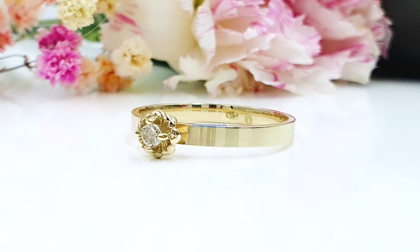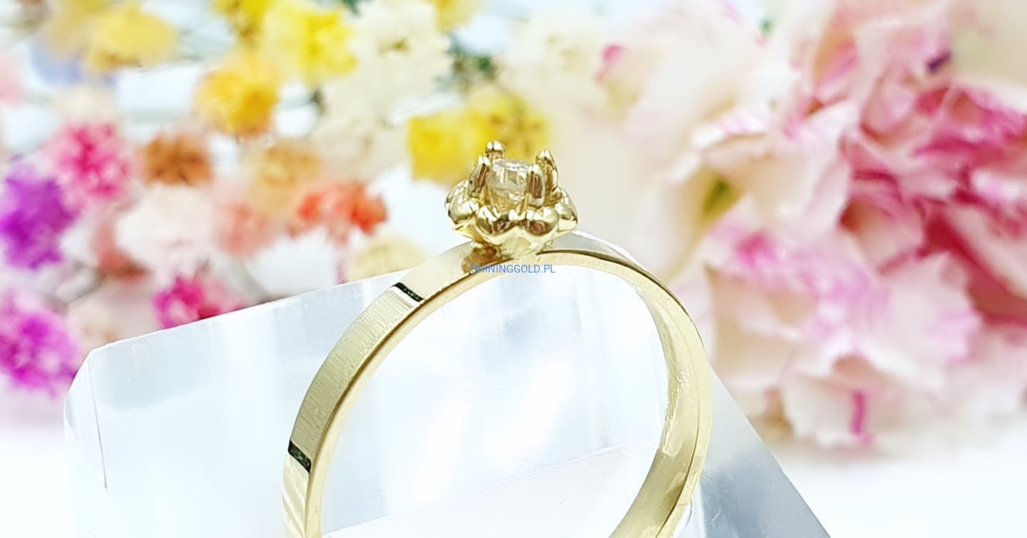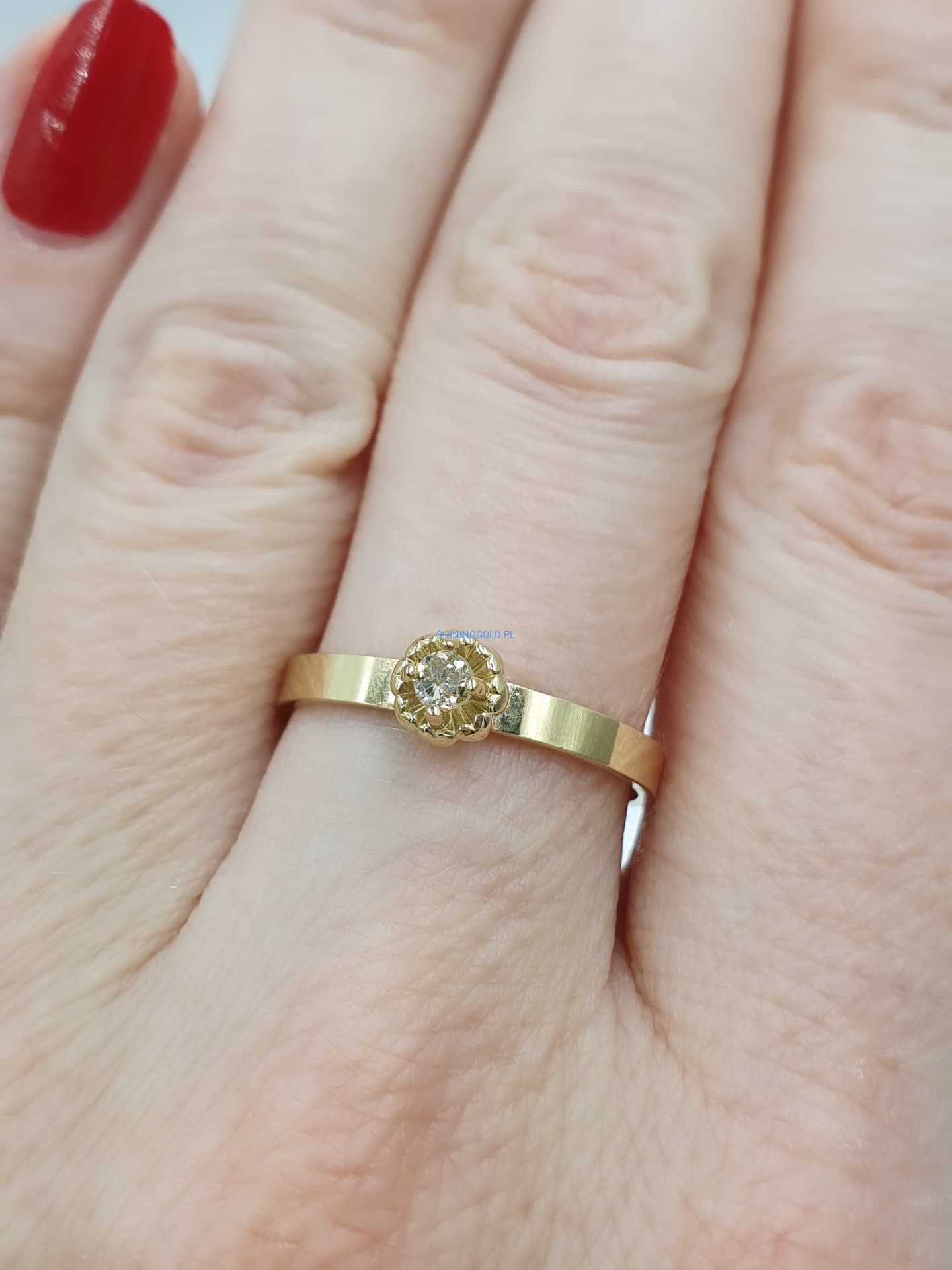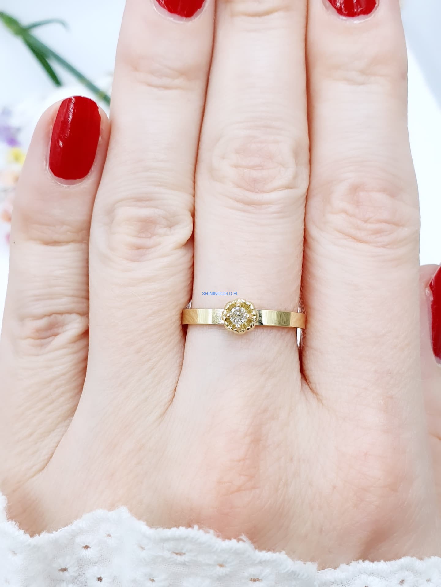 Złoty, nowy pierścionek z diamentem (1115ws) to klasyczna i ponadczasowa biżuteria, która zachwyca elegancją w najczystszej postaci. Wykonany ze złota próby 585, zdobiony jest naturalnym diamentem o masie 0,10 ct, czystości SI i barwie H.
