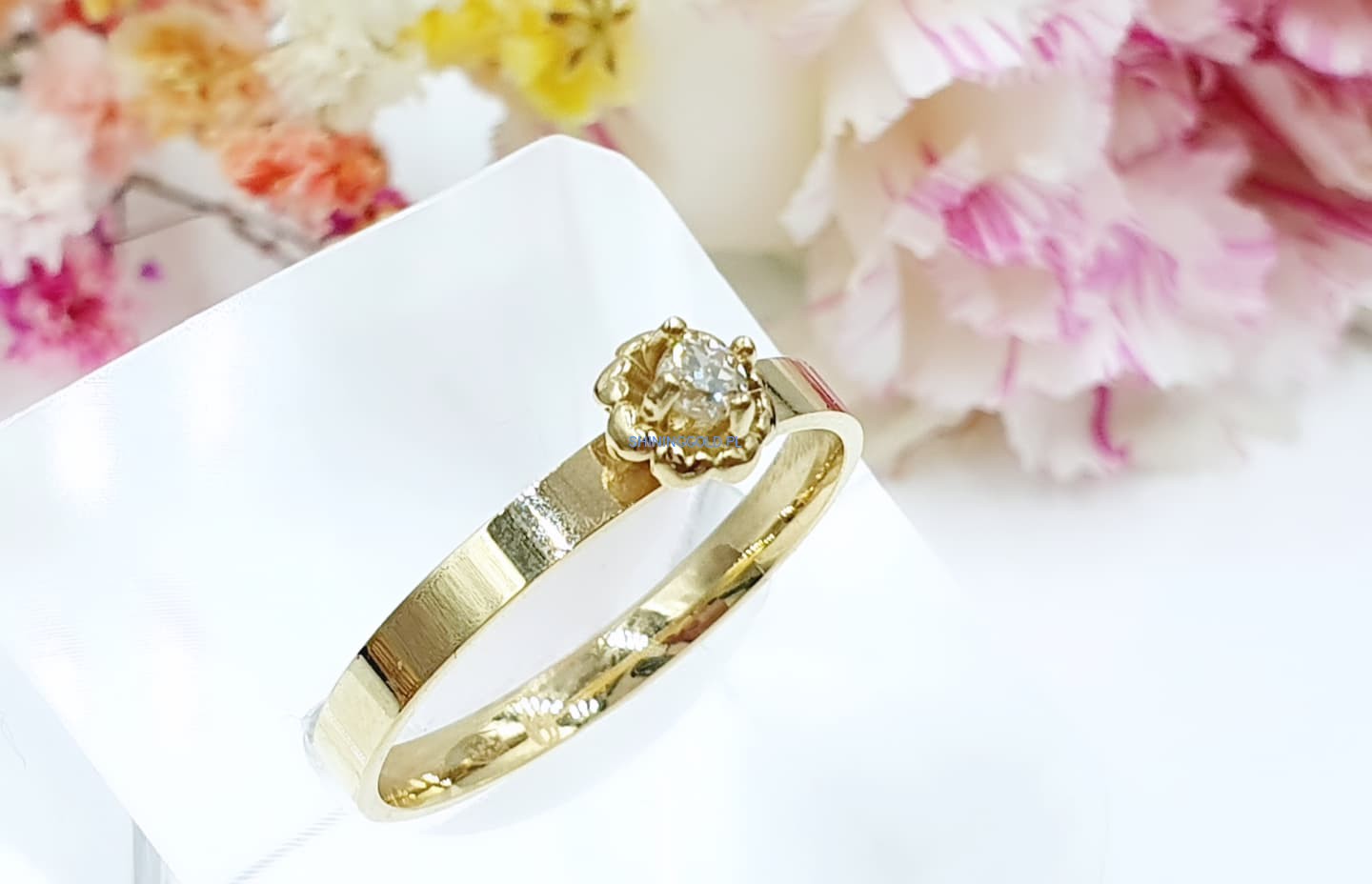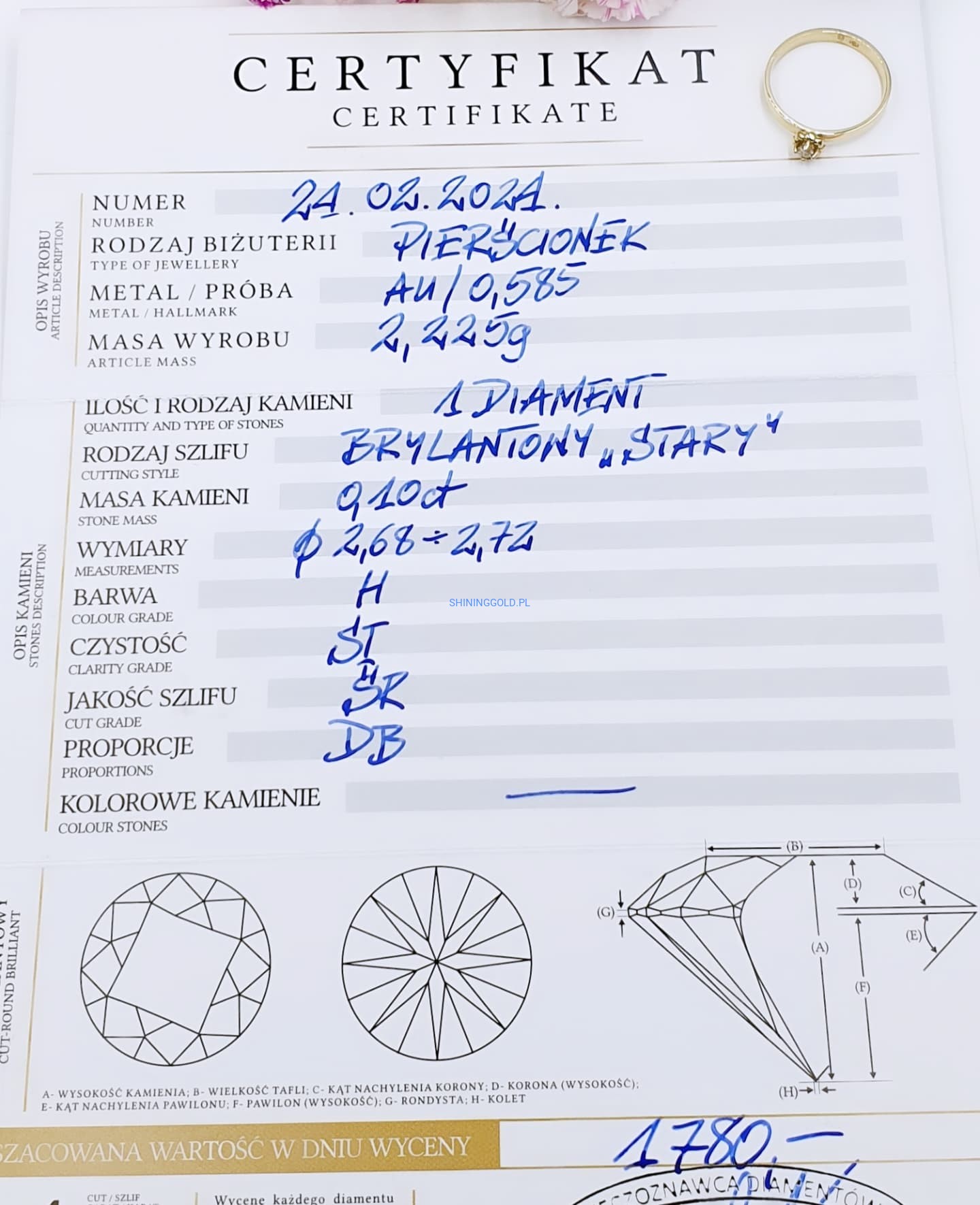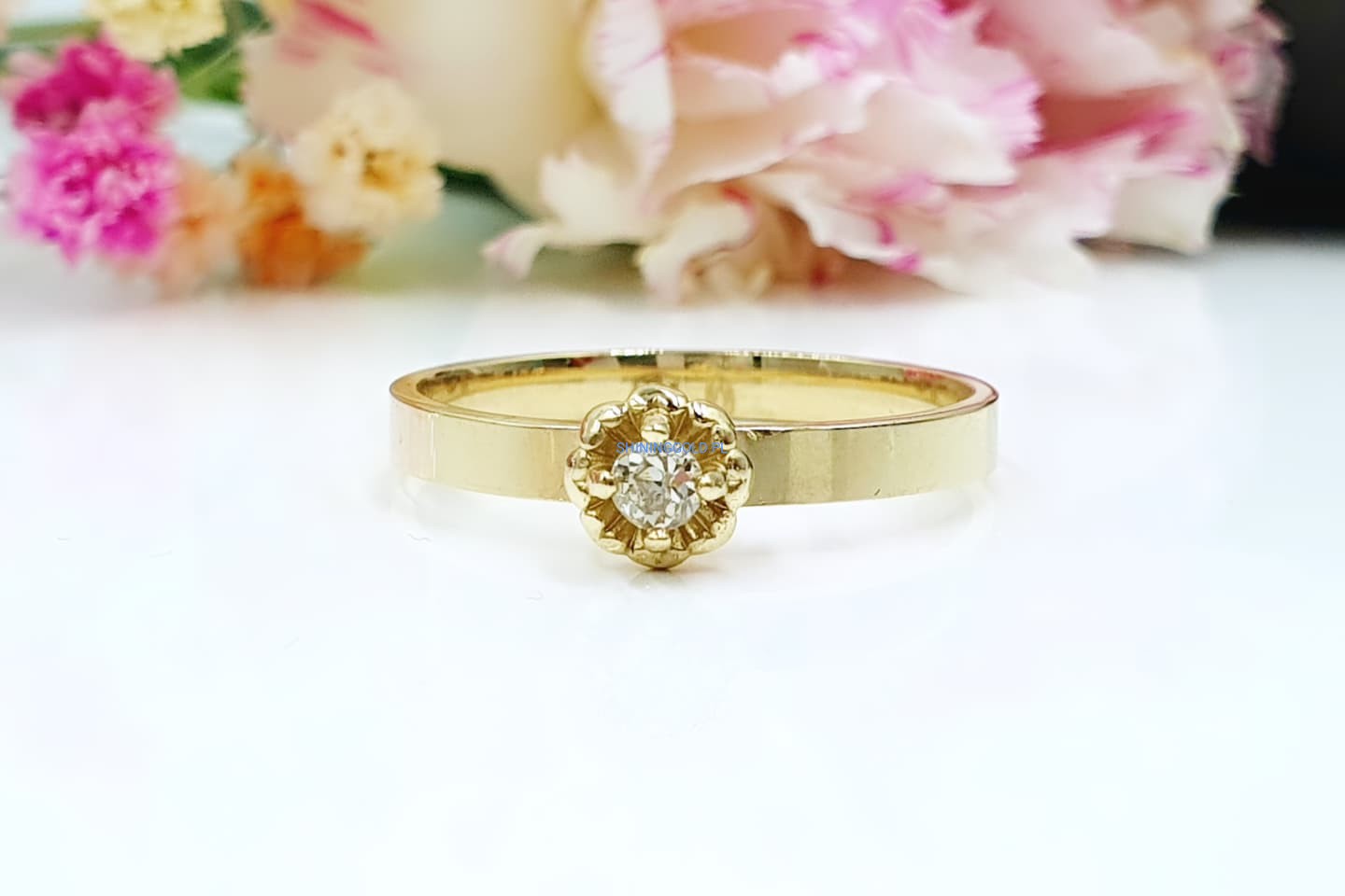 Złoty, nowy pierścionek z diamentem (1115ws) to klasyczna i ponadczasowa biżuteria, która zachwyca elegancją w najczystszej postaci. Wykonany ze złota próby 585, zdobiony jest naturalnym diamentem o masie 0,10 ct, czystości SI i barwie H.