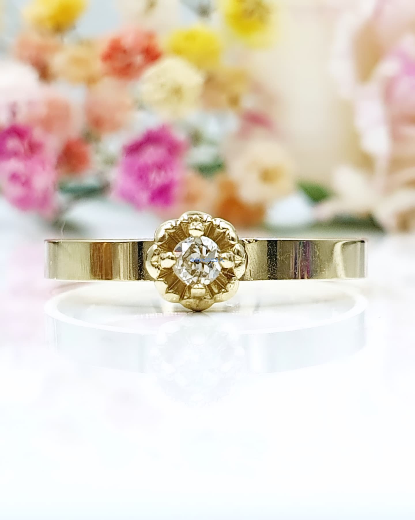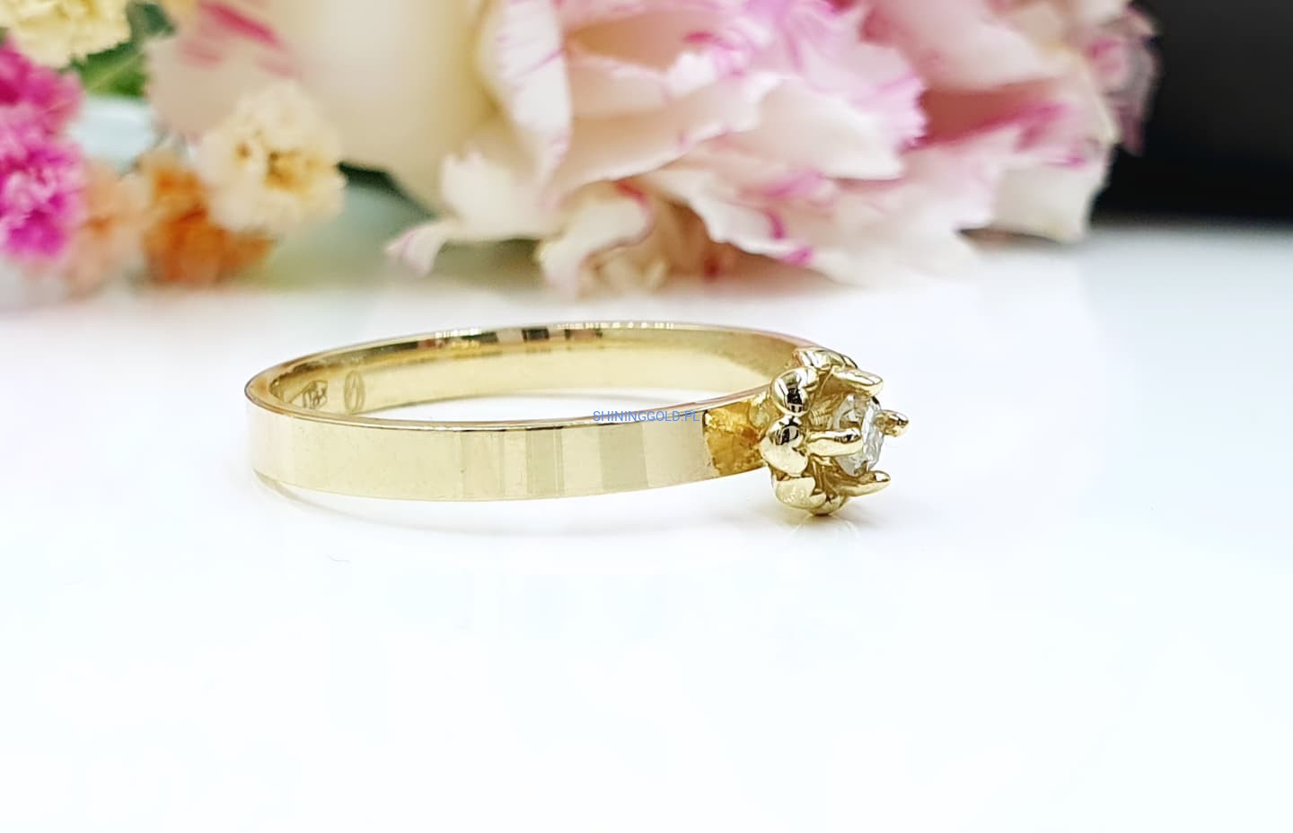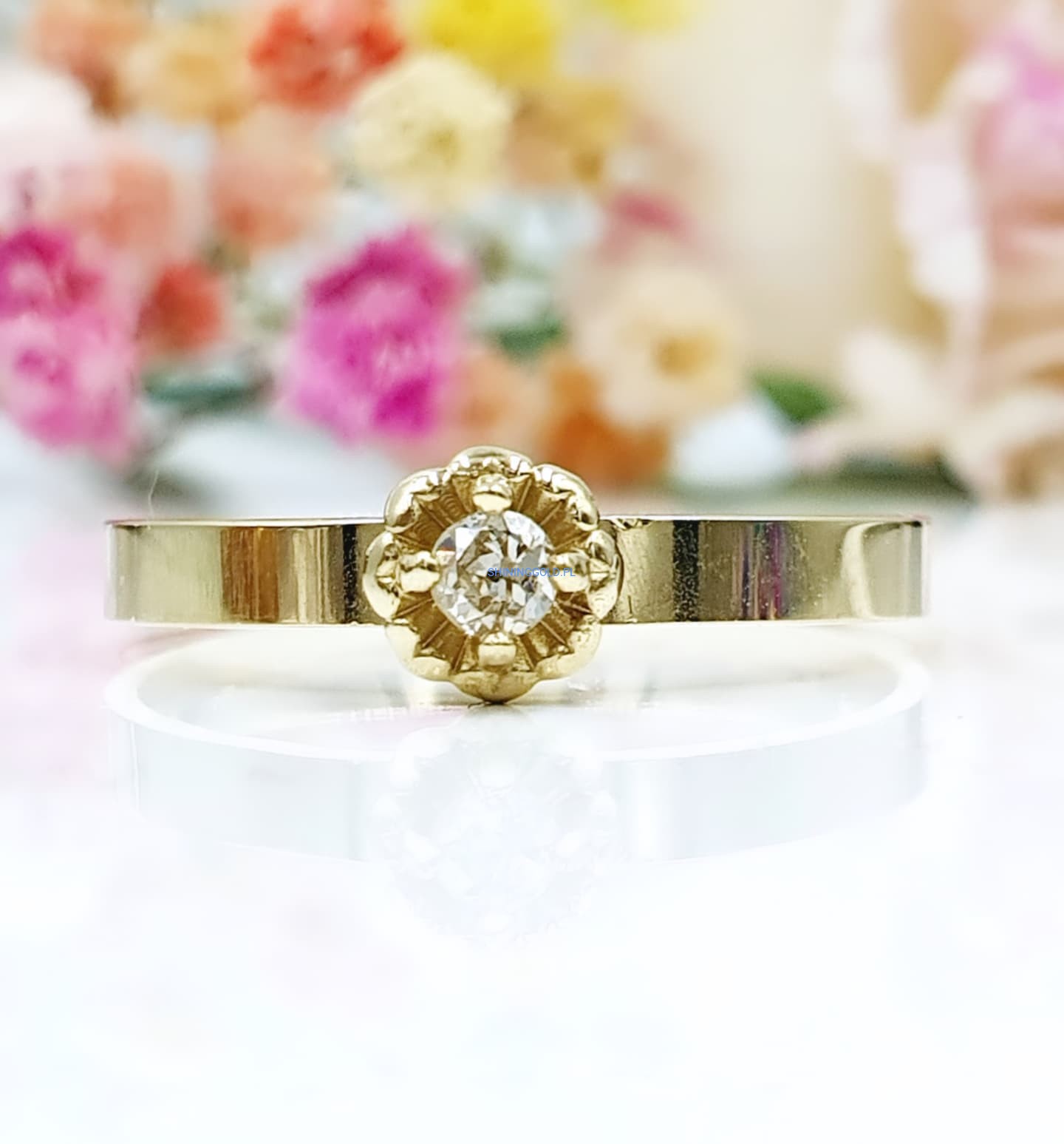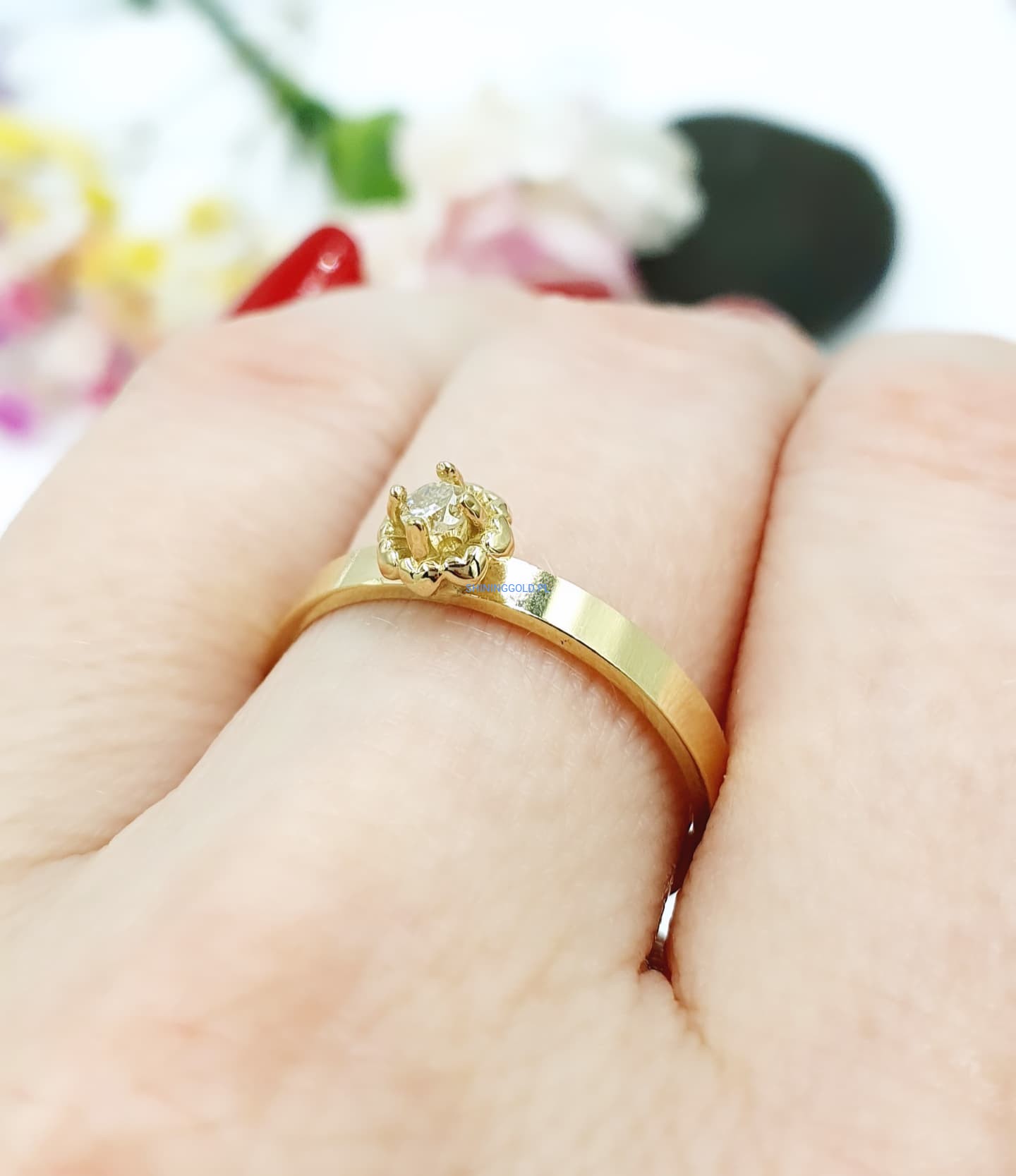 Złoty, nowy pierścionek z diamentem (1115ws) to klasyczna i ponadczasowa biżuteria, która zachwyca elegancją w najczystszej postaci. Wykonany ze złota próby 585, zdobiony jest naturalnym diamentem o masie 0,10 ct, czystości SI i barwie H.