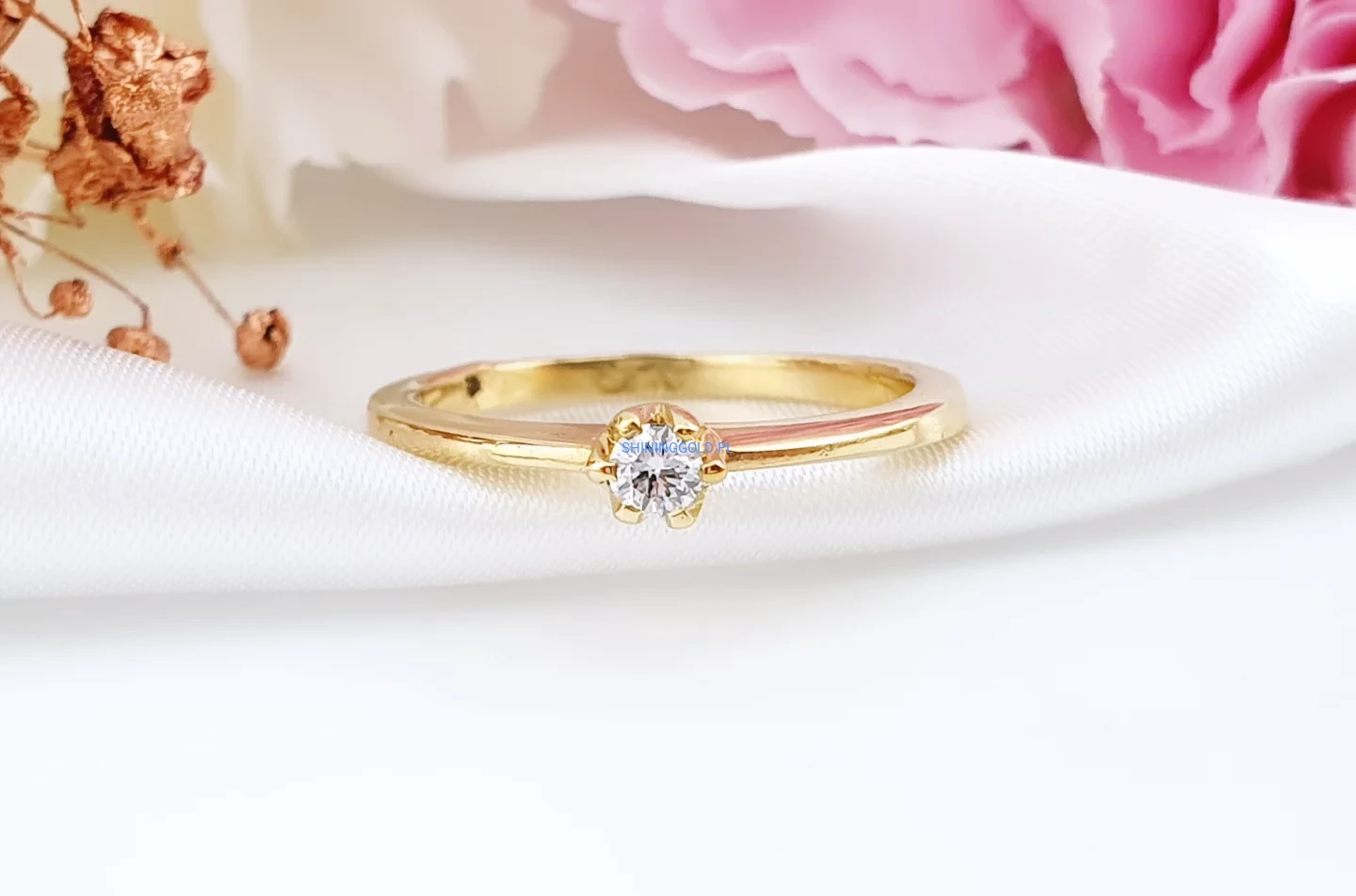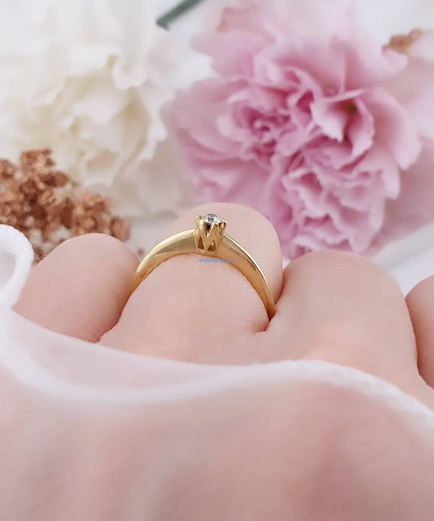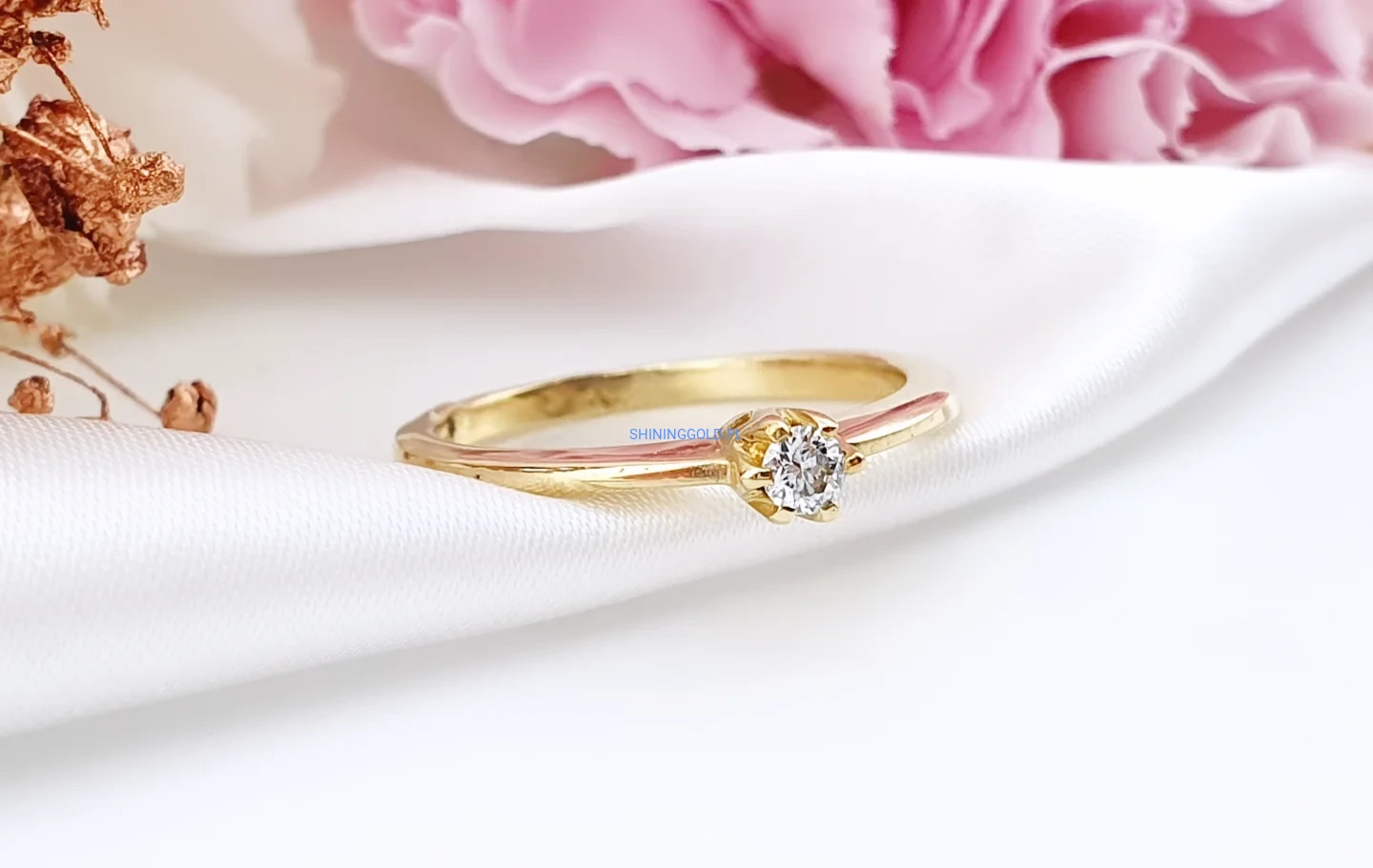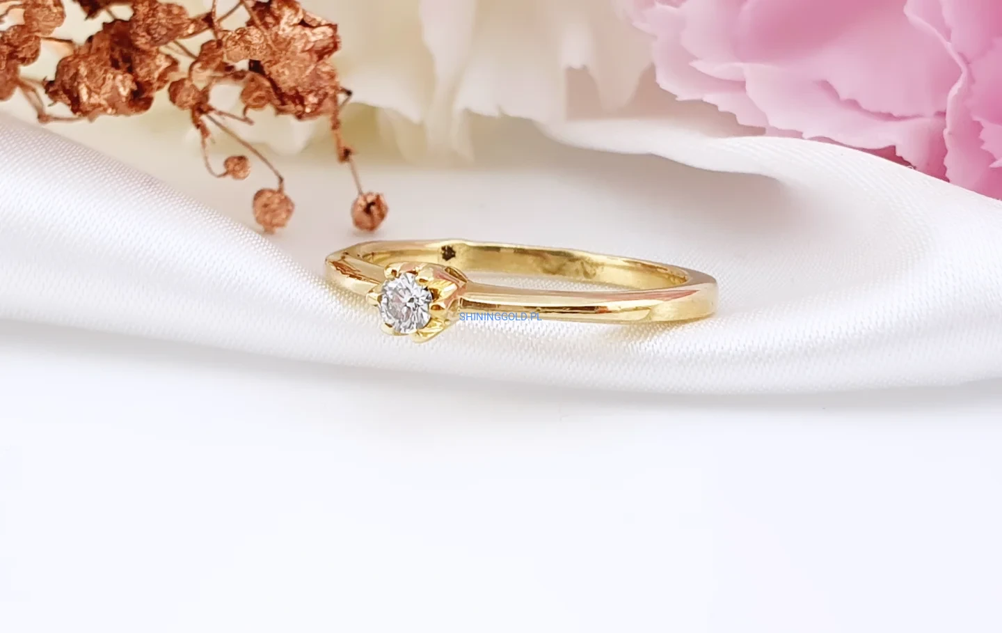 Delikatny i elegancki pierścionek wykonany z żółtego złota próby 585, ozdobiony naturalnym diamentem w klasycznym szlifie brylantowym. Subtelnie osadzony kamień o masie ok. 0,08 ct pięknie odbija światło, nadając biżuterii wyjątkowego blasku i ponadczasowego charakteru.