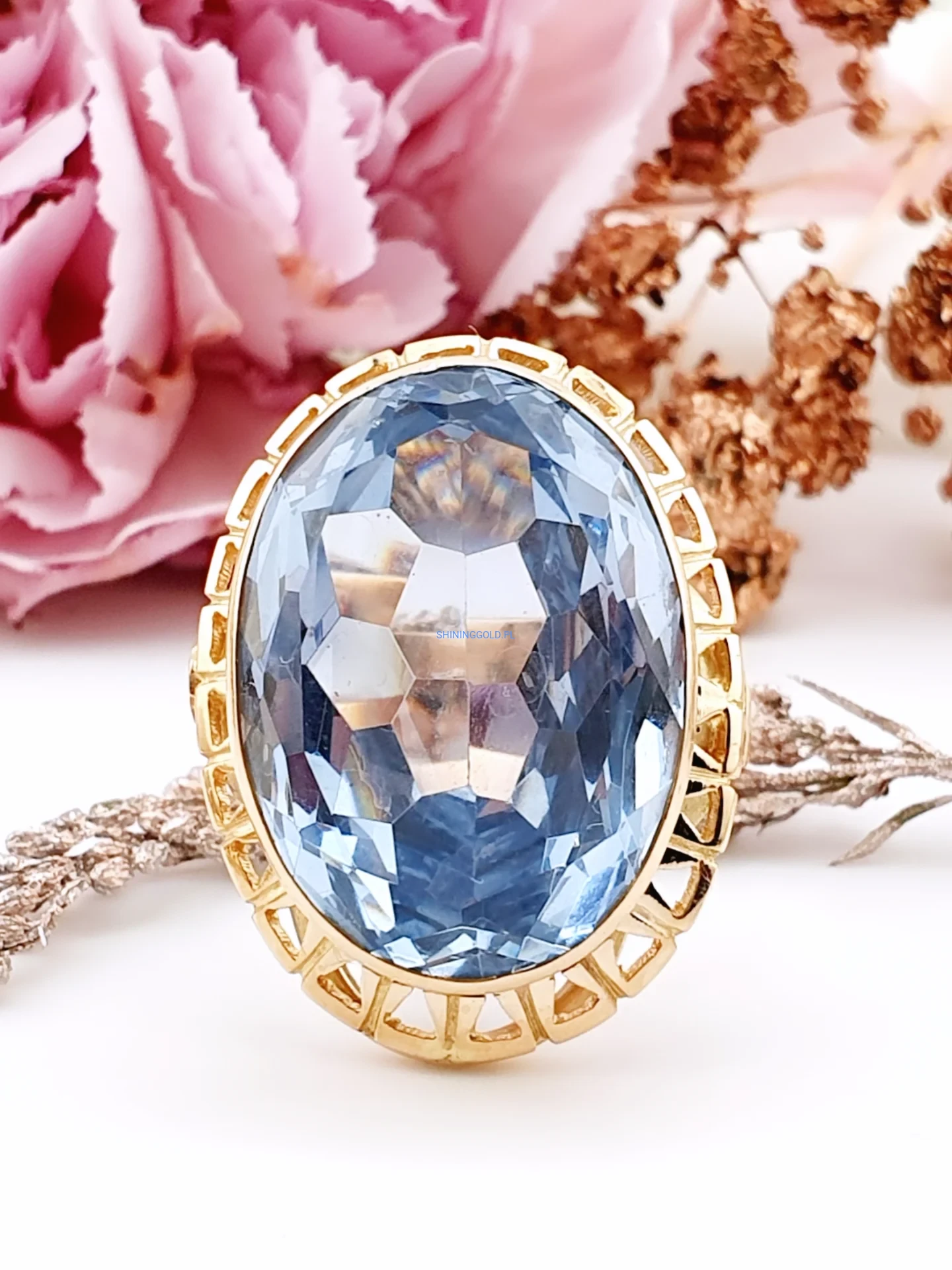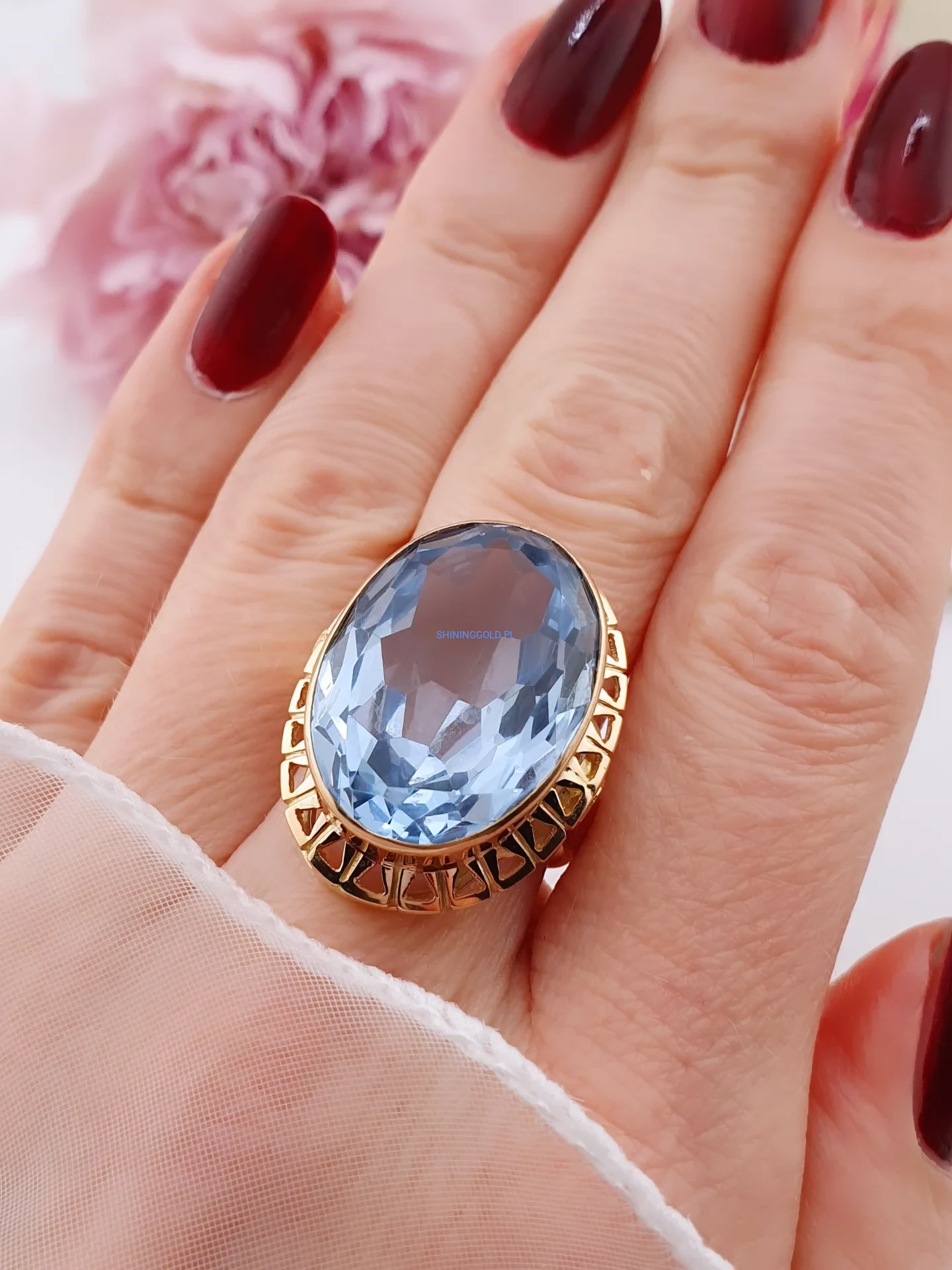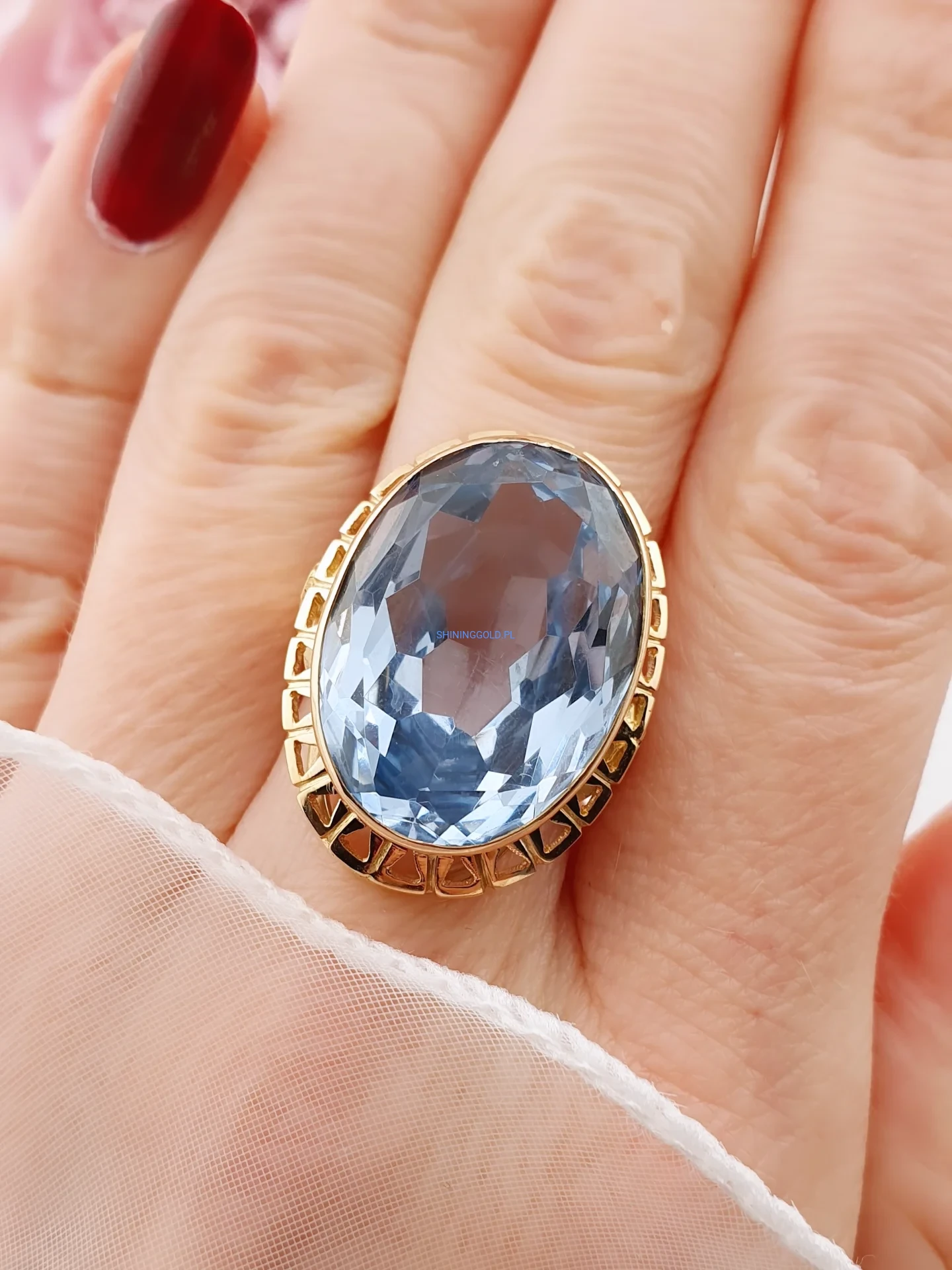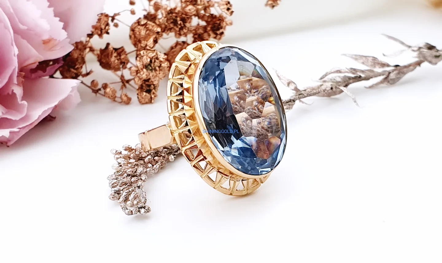 Imponujący pierścionek wykonany ze złota próby 585, ozdobiony dużym, fasetowanym niebieskim kamieniem o pięknym połysku i głębi koloru. Owalny kamień został osadzony w dekoracyjnej, ażurowej oprawie, która podkreśla jego rozmiar i elegancki charakter całości.