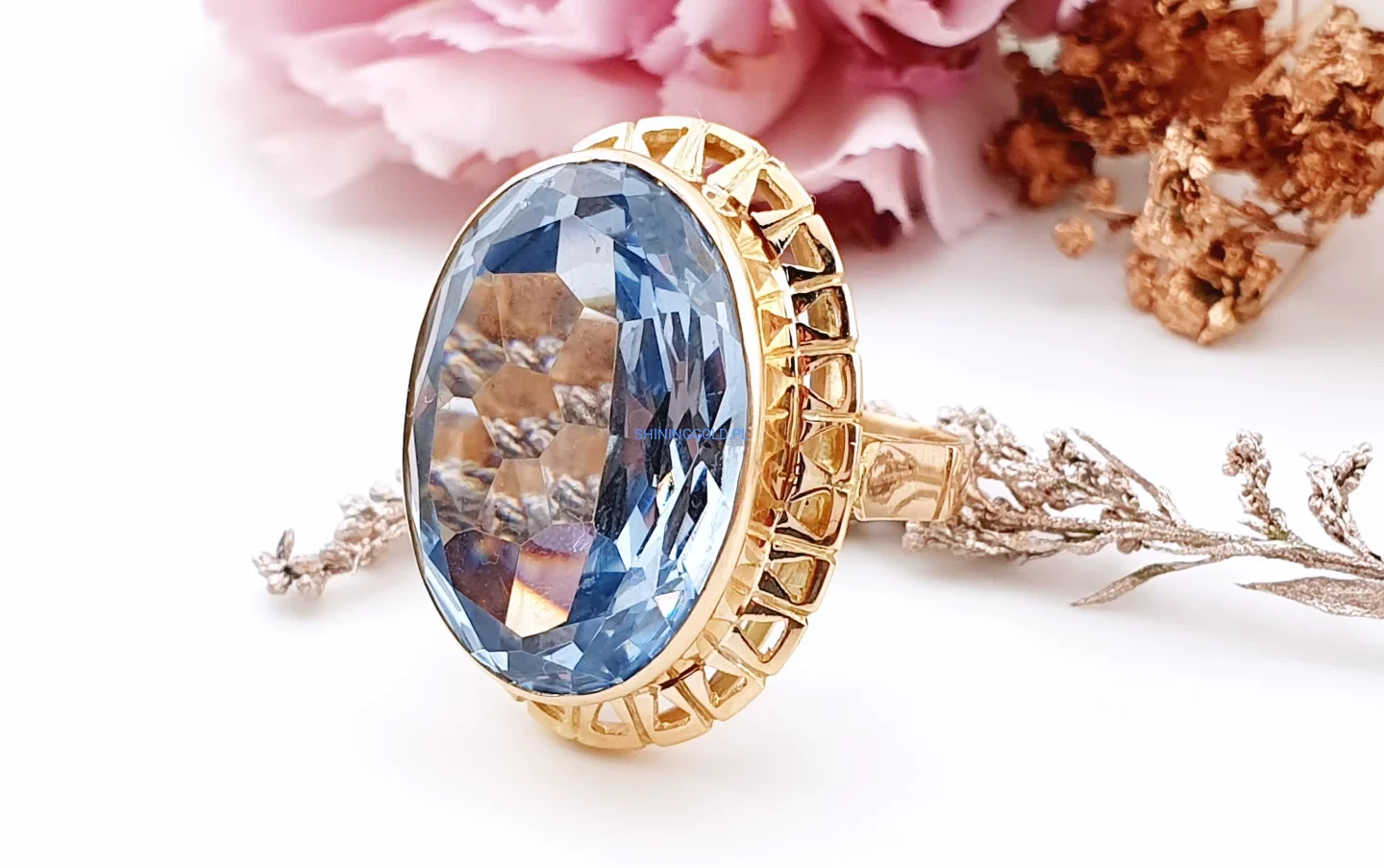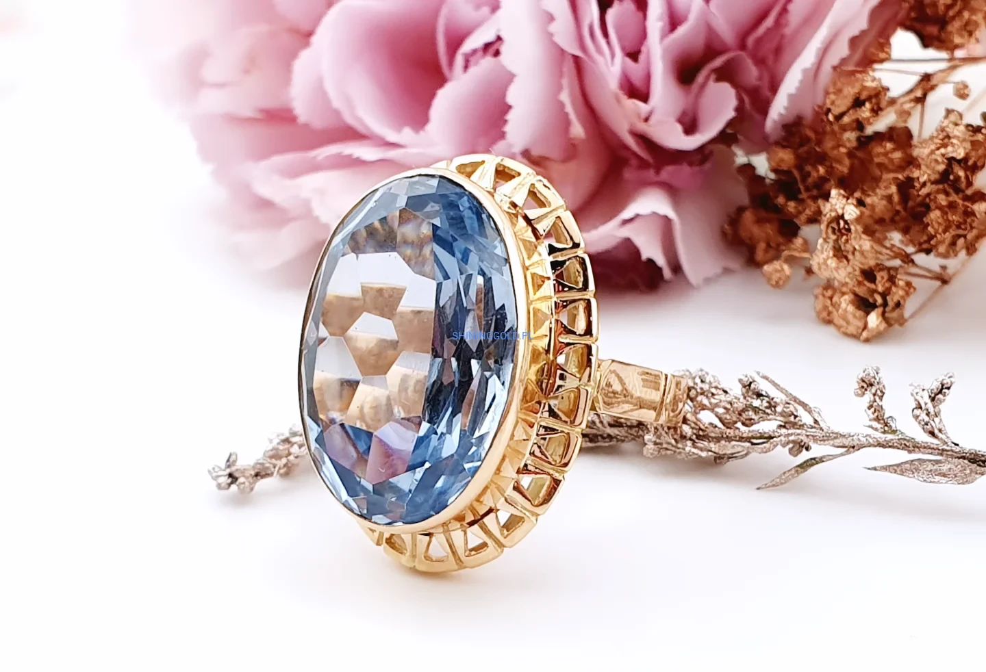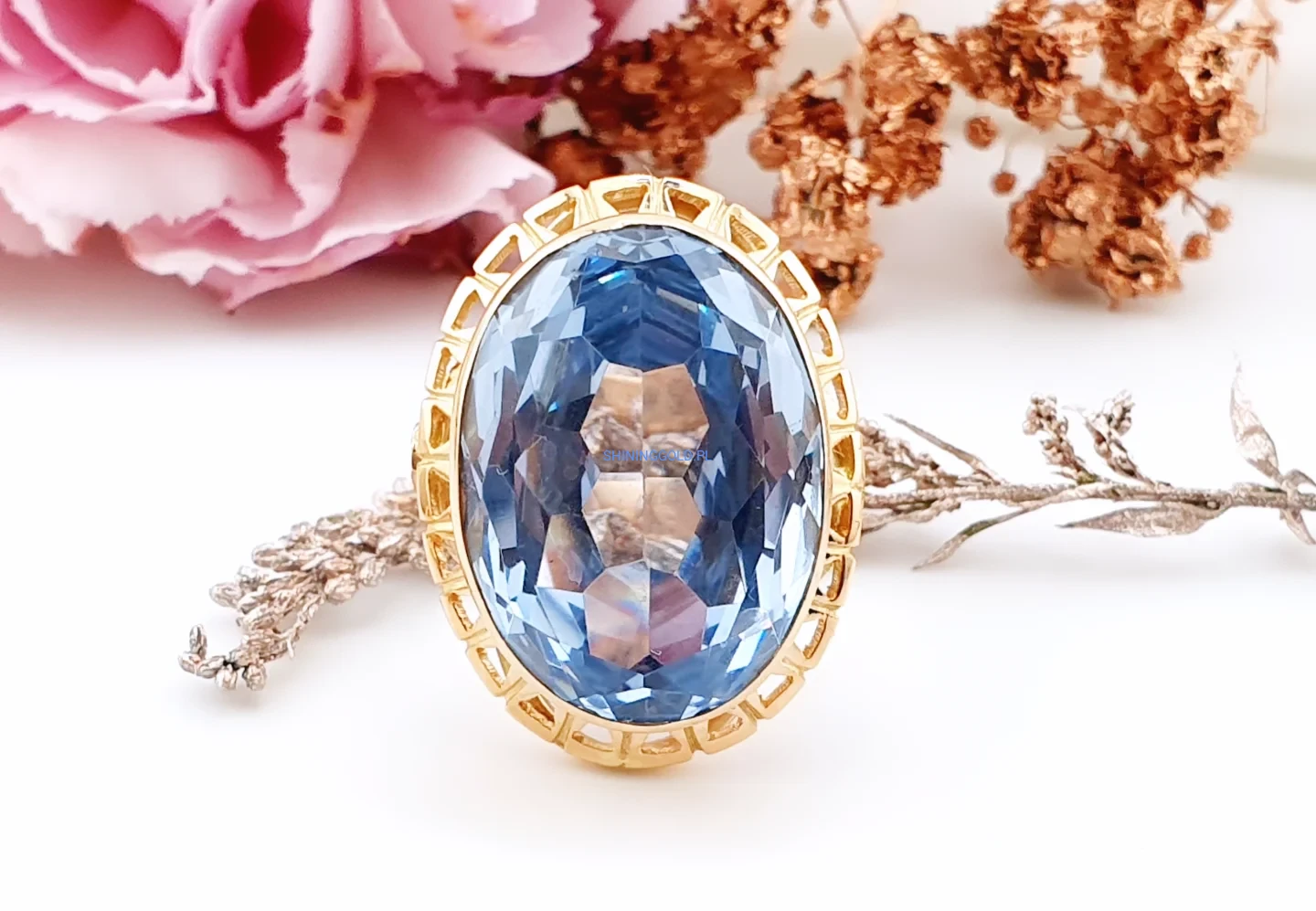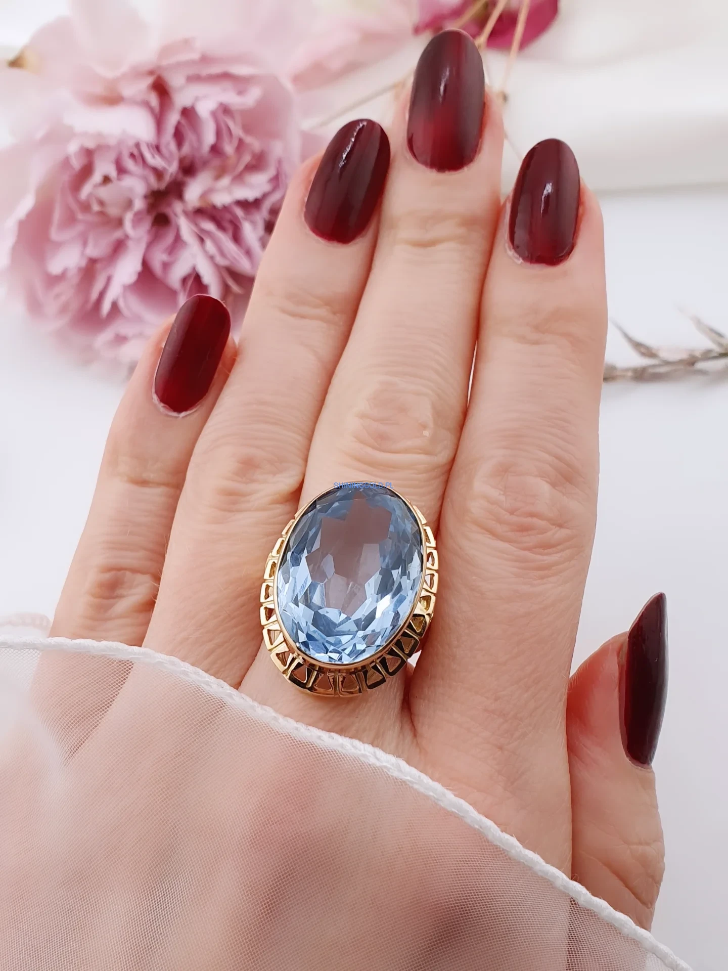 Imponujący pierścionek wykonany ze złota próby 585, ozdobiony dużym, fasetowanym niebieskim kamieniem o pięknym połysku i głębi koloru. Owalny kamień został osadzony w dekoracyjnej, ażurowej oprawie, która podkreśla jego rozmiar i elegancki charakter całości.