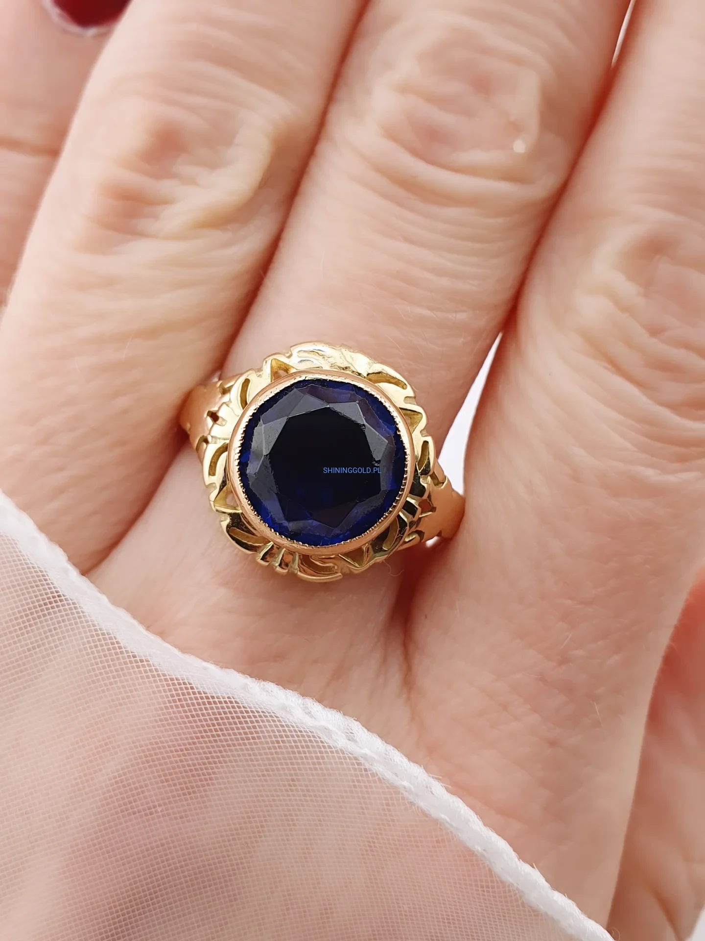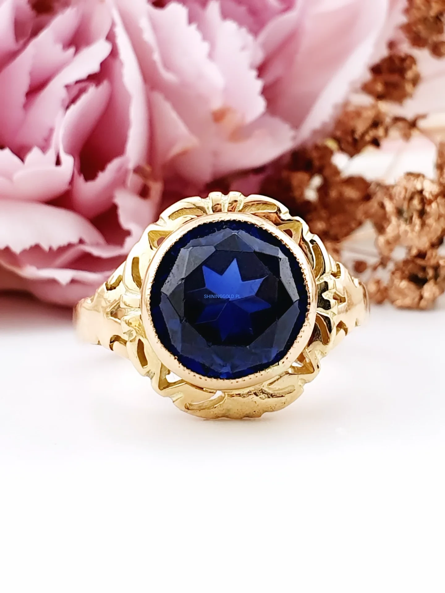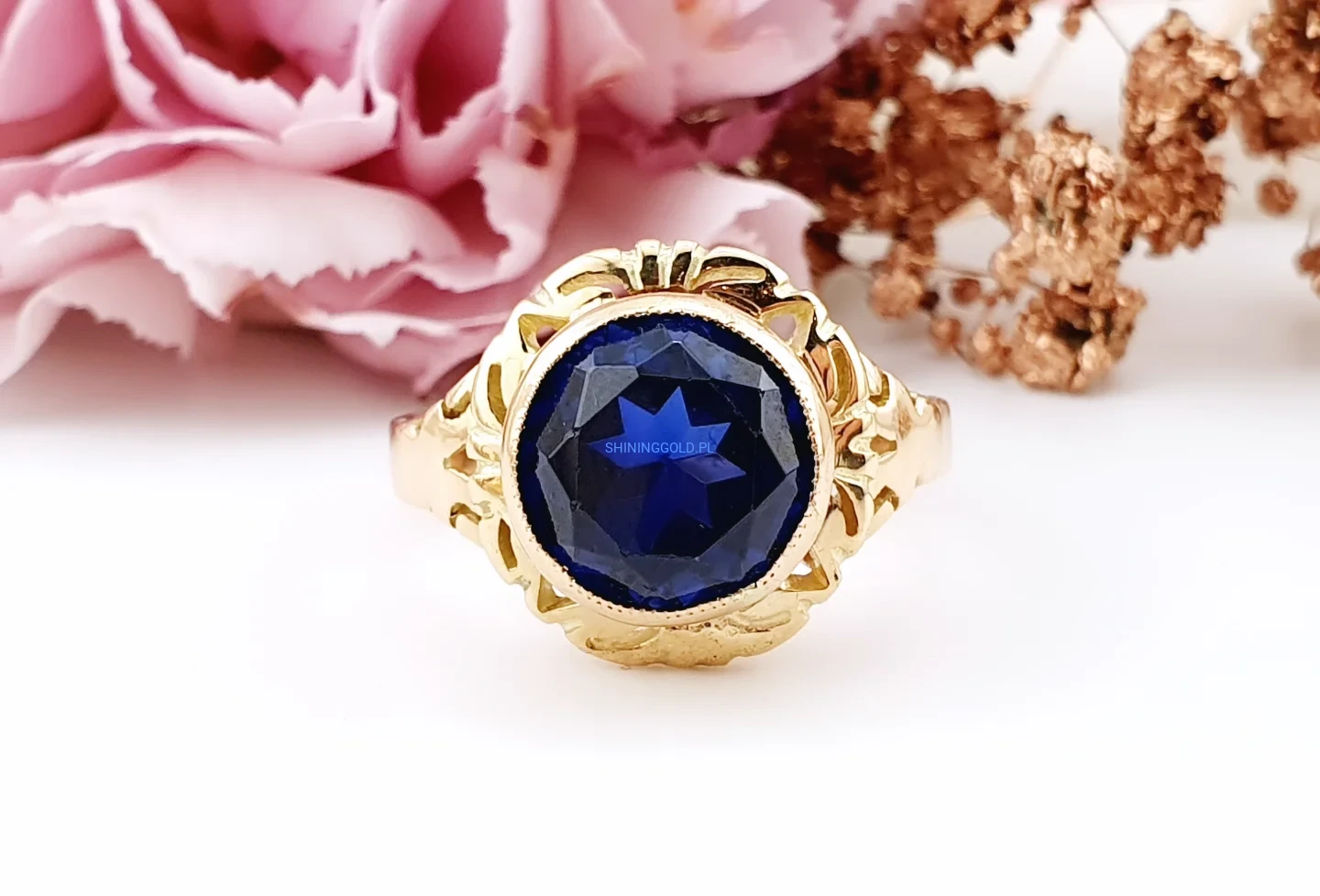 Stylowy, solidny pierścionek wykonany ze złota próby 585, ozdobiony dużym, fasetowanym granatowym kamieniem syntetycznym. Głęboki kolor kamienia pięknie kontrastuje z ciepłym odcieniem złota, a dekoracyjna, ażurowa oprawa nadaje biżuterii elegancki i nieco retro charakter.