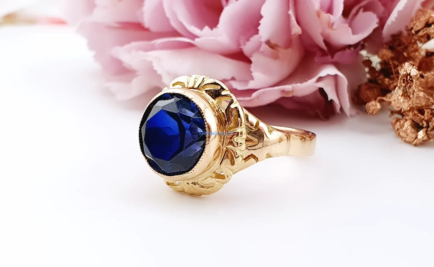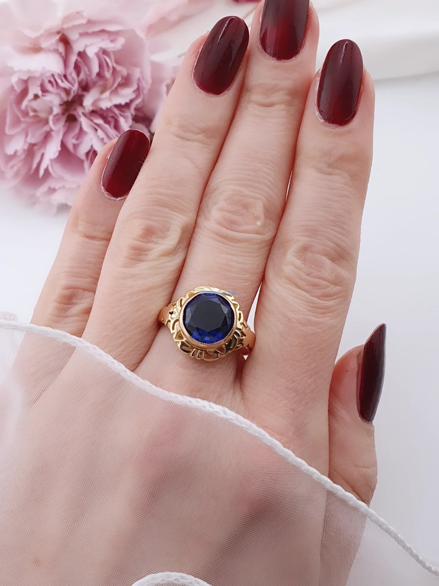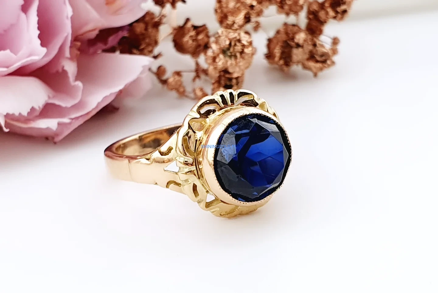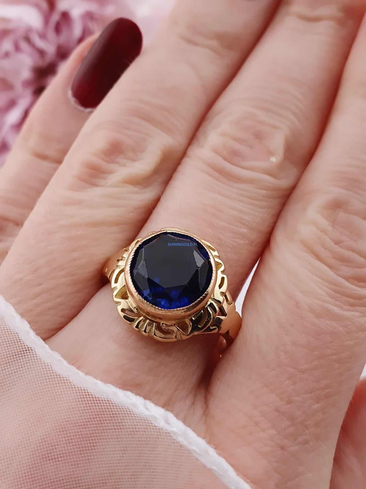 Stylowy, solidny pierścionek wykonany ze złota próby 585, ozdobiony dużym, fasetowanym granatowym kamieniem syntetycznym. Głęboki kolor kamienia pięknie kontrastuje z ciepłym odcieniem złota, a dekoracyjna, ażurowa oprawa nadaje biżuterii elegancki i nieco retro charakter.