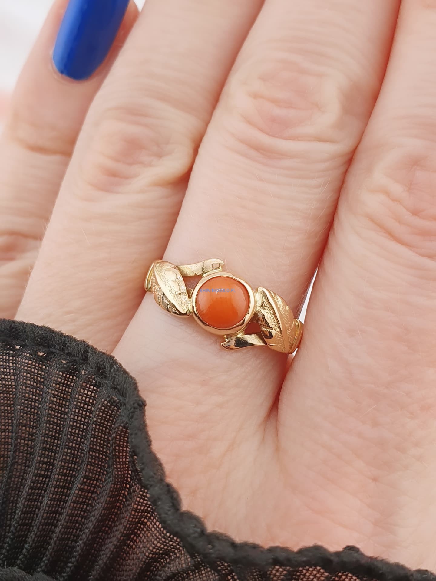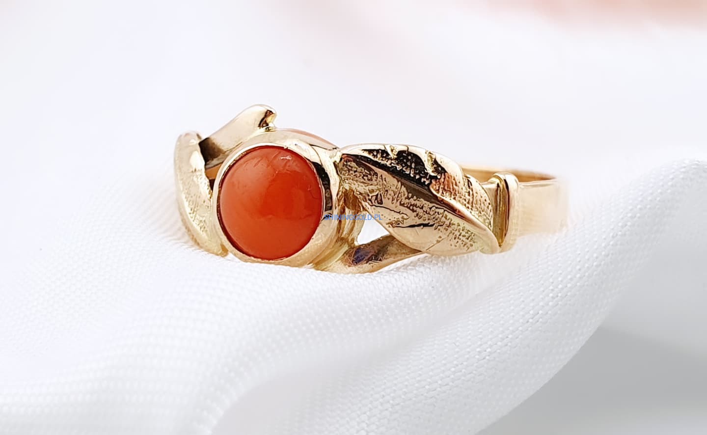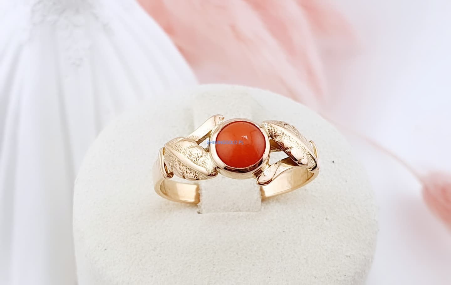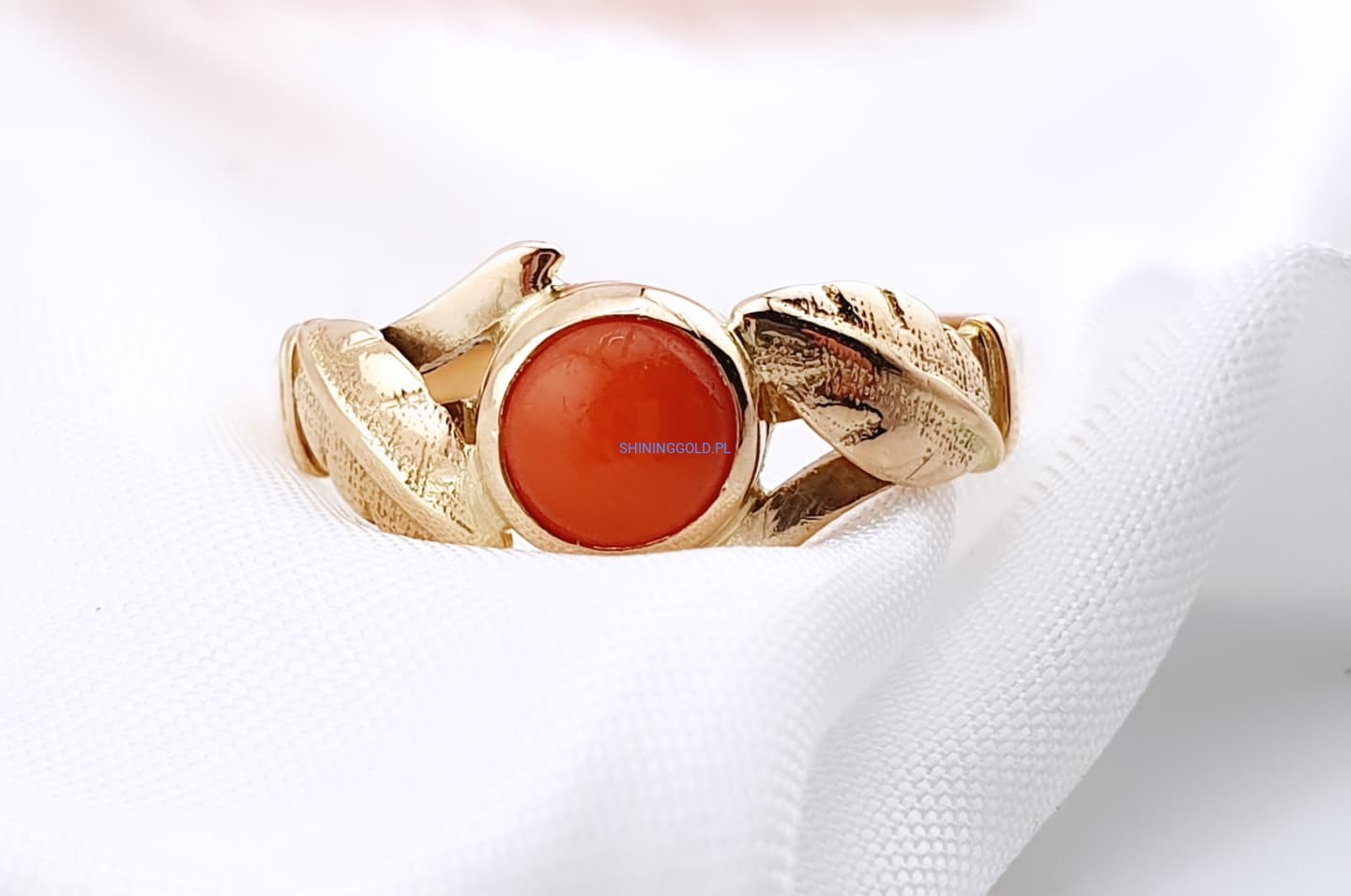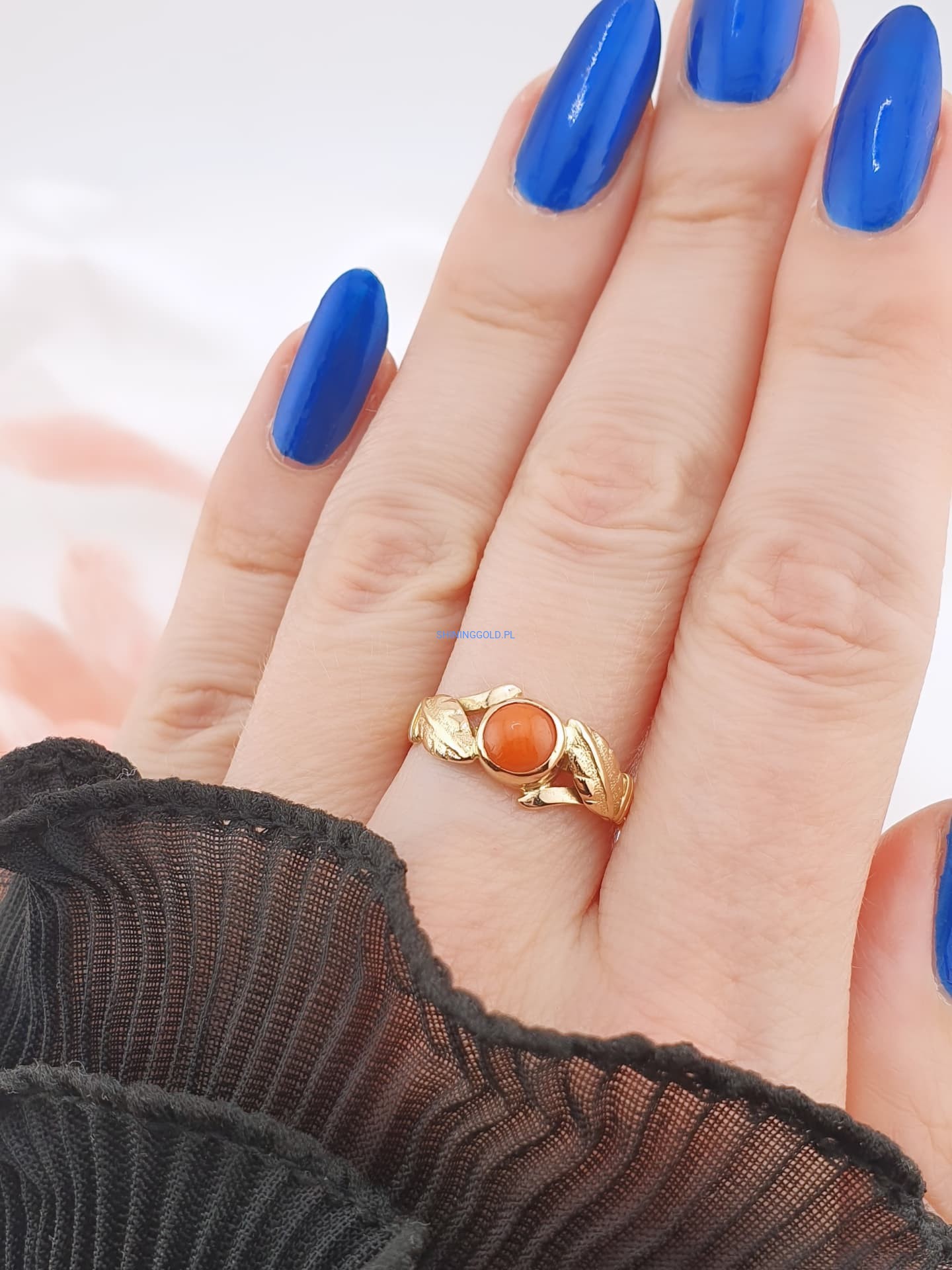 Złoty pierścionek z naturalnym koralem to wyjątkowy dodatek, w którym klasyczna elegancja spotyka się z subtelnym urokiem natury. Centralny, intensywnie czerwony kamień symbolizuje energię i pasję, a jego barwa pięknie kontrastuje z ciepłym odcieniem złota. Finezyjne zdobienia w formie liści nadają całości lekkości i sprawiają, że pierścionek prezentuje się niezwykle stylowo. To idealna propozycja dla osób ceniących biżuterię z charakterem i nutą vintage.