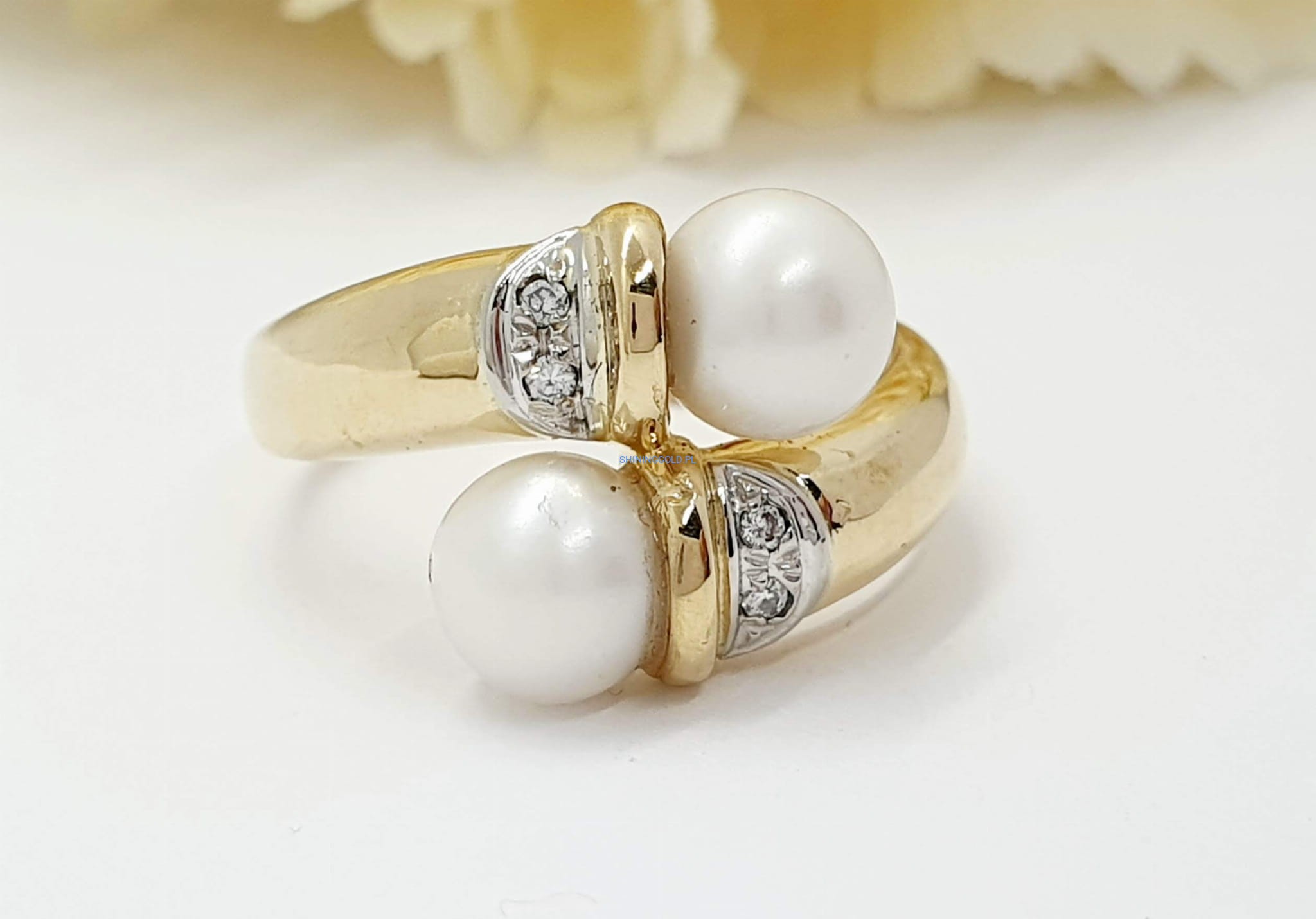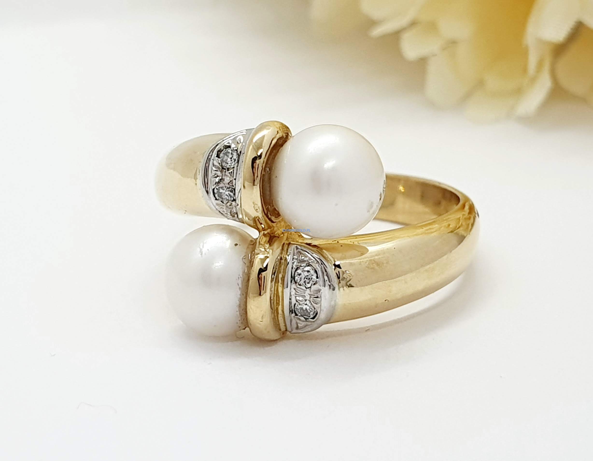 Złoty pierścionek z perłami i diamentami