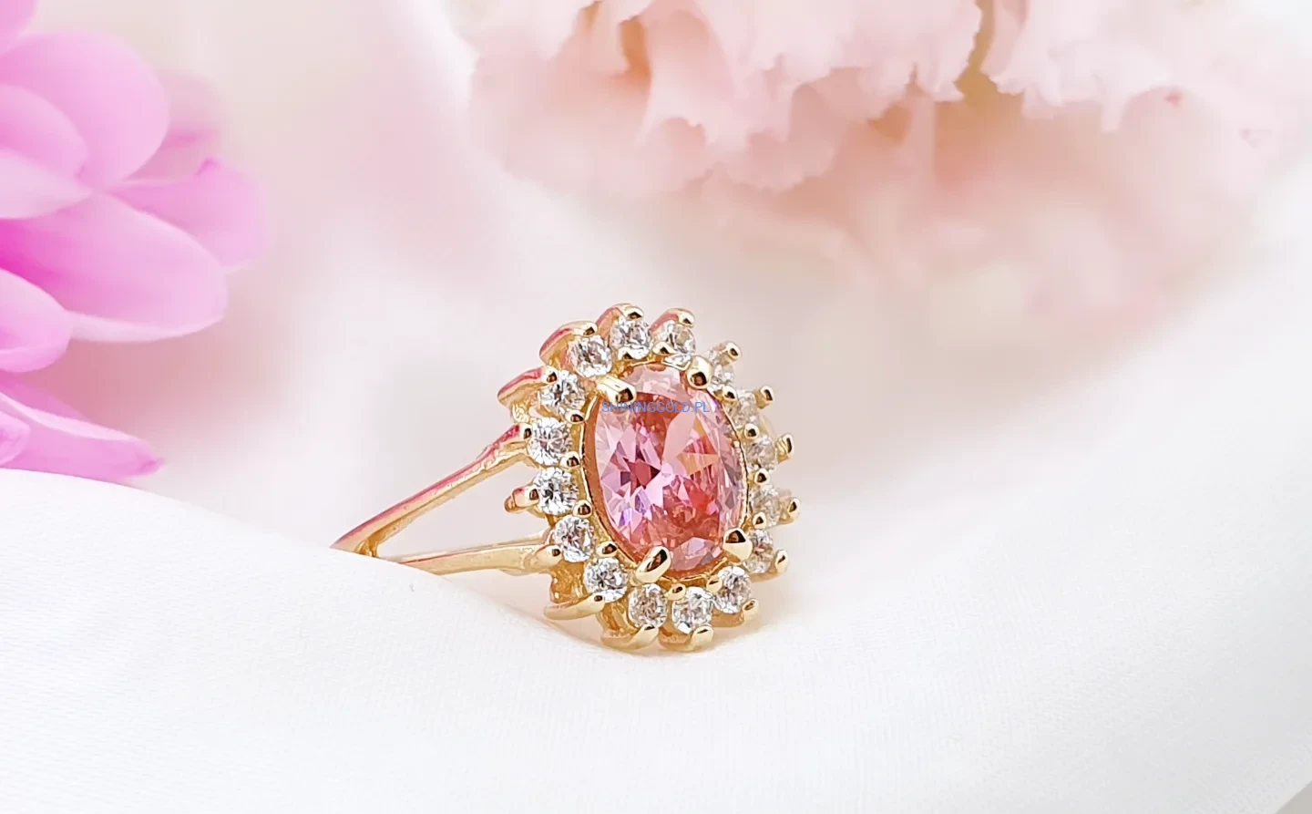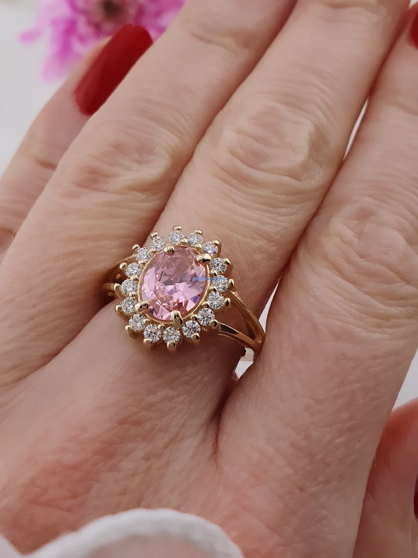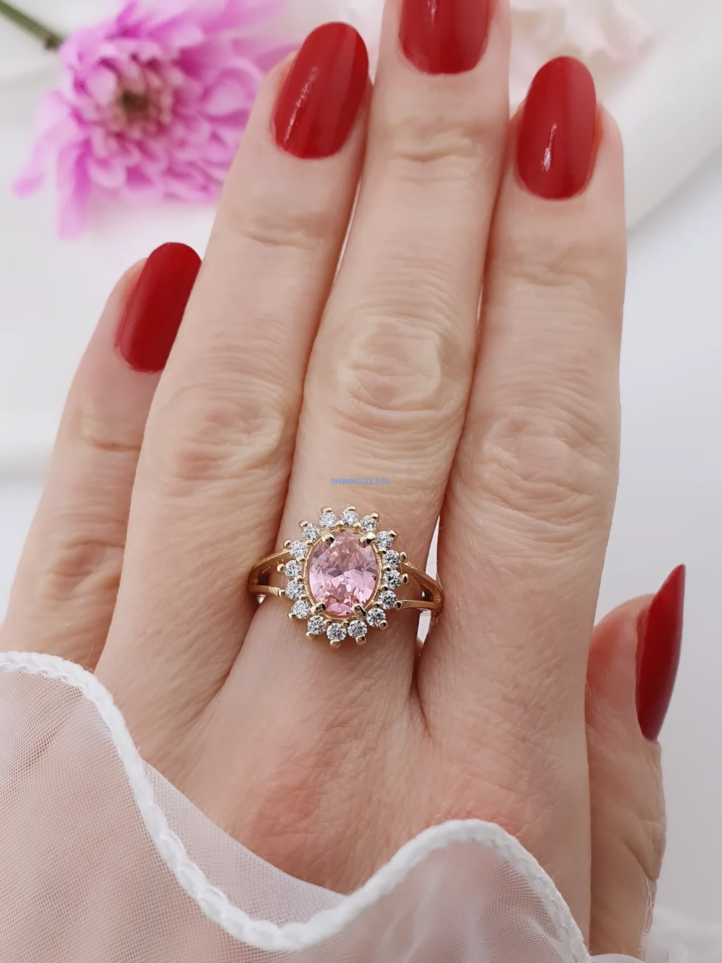 Złoty pierścionek z różową cyrkonią i oprawą z białych cyrkonii (007P)