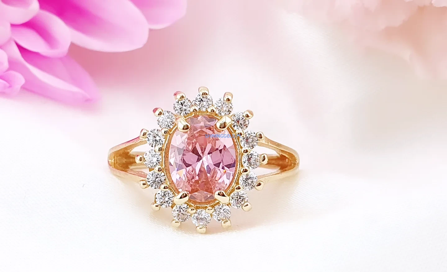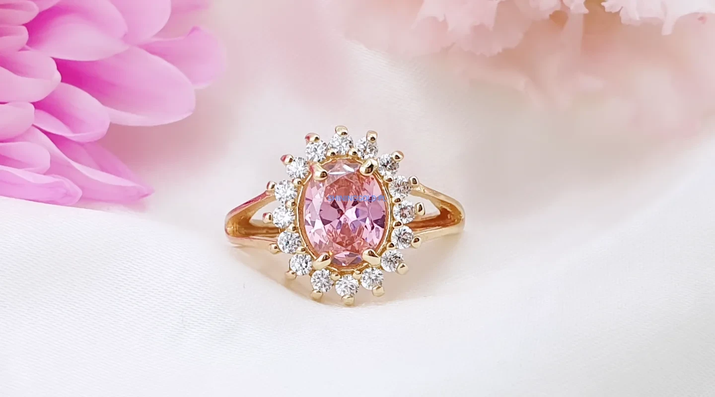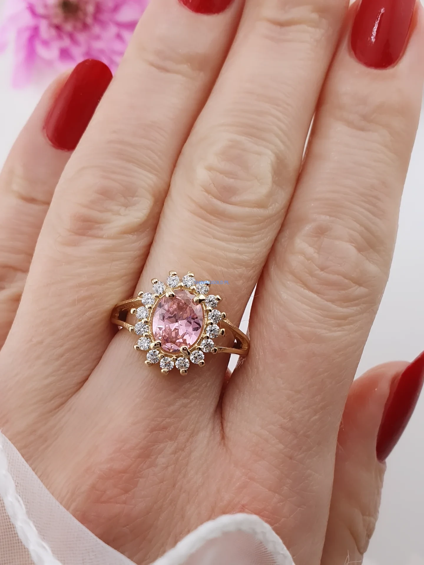 Złoty pierścionek z różową cyrkonią i oprawą z białych cyrkonii (007P)
