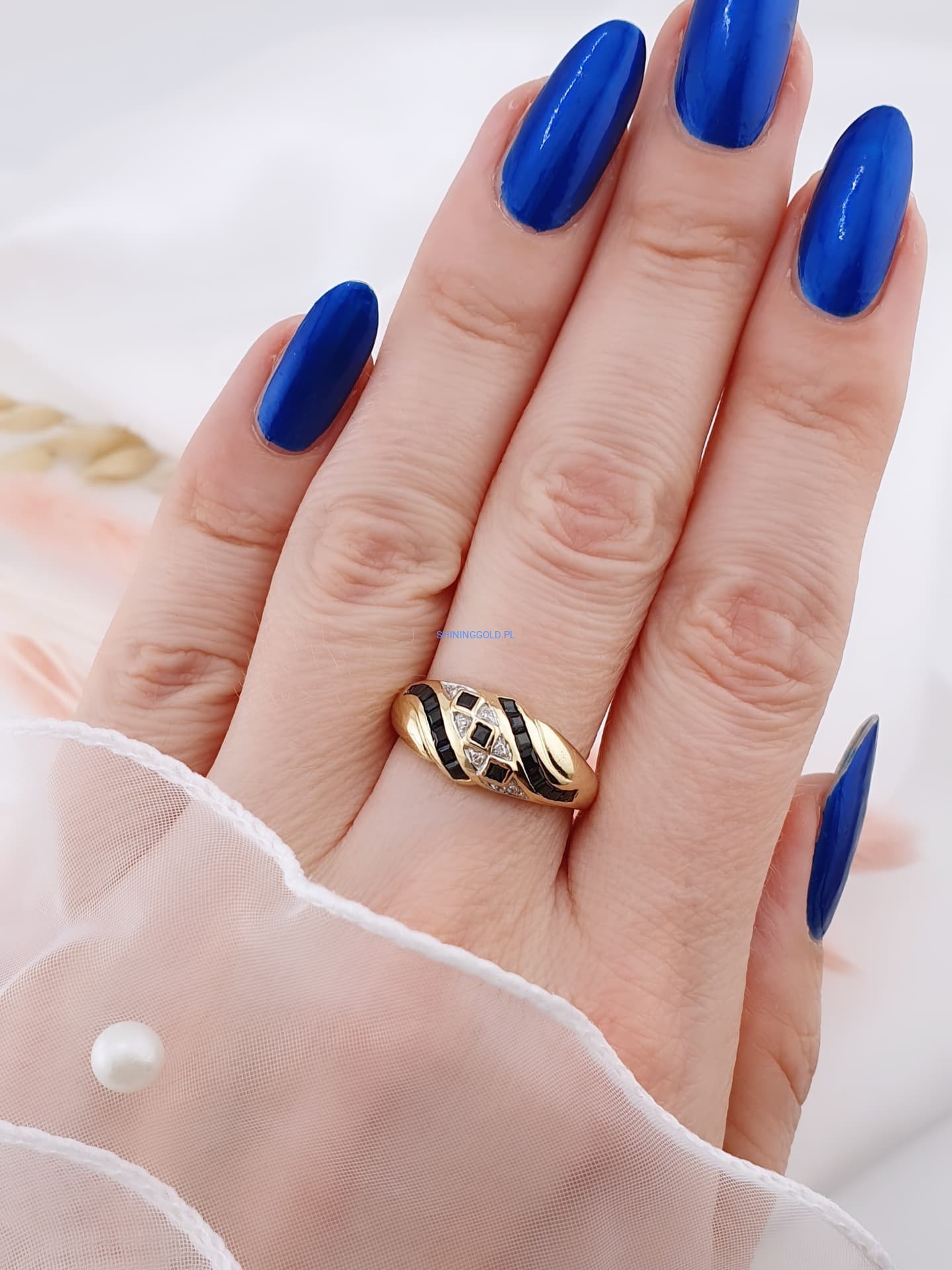 Złoty pierścionek z szafirami i diamentami to połączenie królewskiego szyku i subtelnej elegancji. Wykonany ze złota próby 585, zdobiony jest aż 19 szafirami o łącznej masie 0,76 ct oraz 6 diamentami o masie 0,036 ct (czystość SI1-2, barwa H). Głęboki, granatowy kolor szafirów pięknie kontrastuje z blaskiem diamentów, tworząc wyjątkową i luksusową kompozycję.