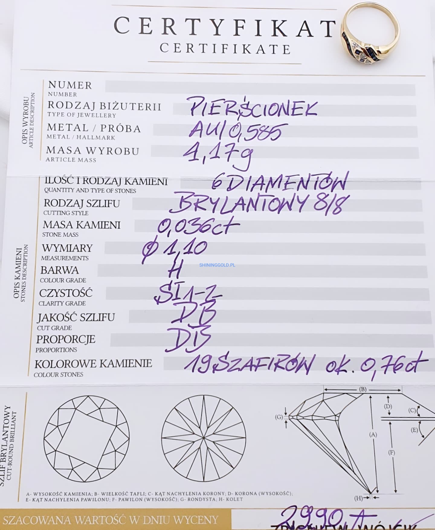 Kamienie: 19 szafirów + 6 diamentów