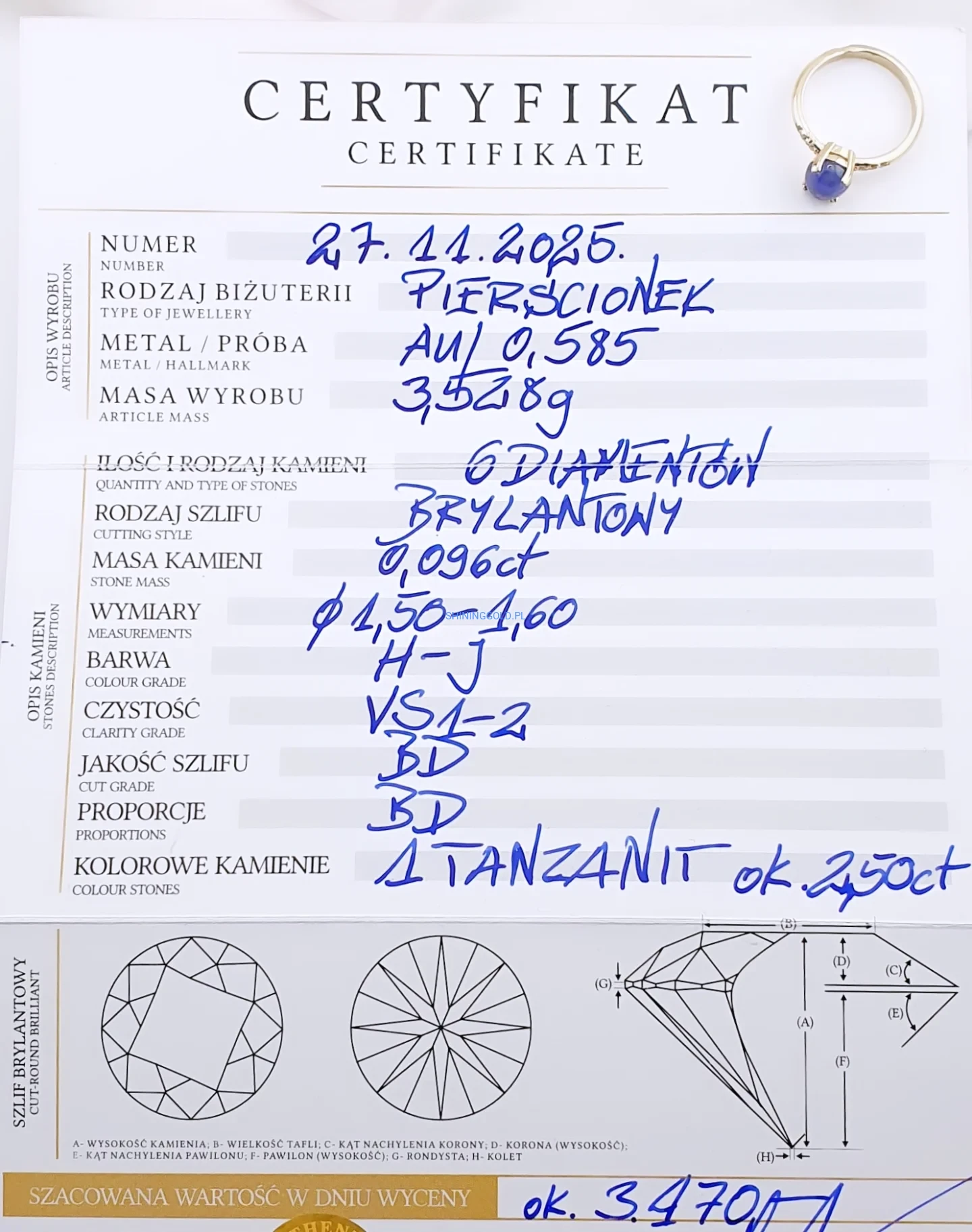 • kamienie: Tanzanit ok. 2,50 ct + 6 diamentów brylantowych 0,096 ct