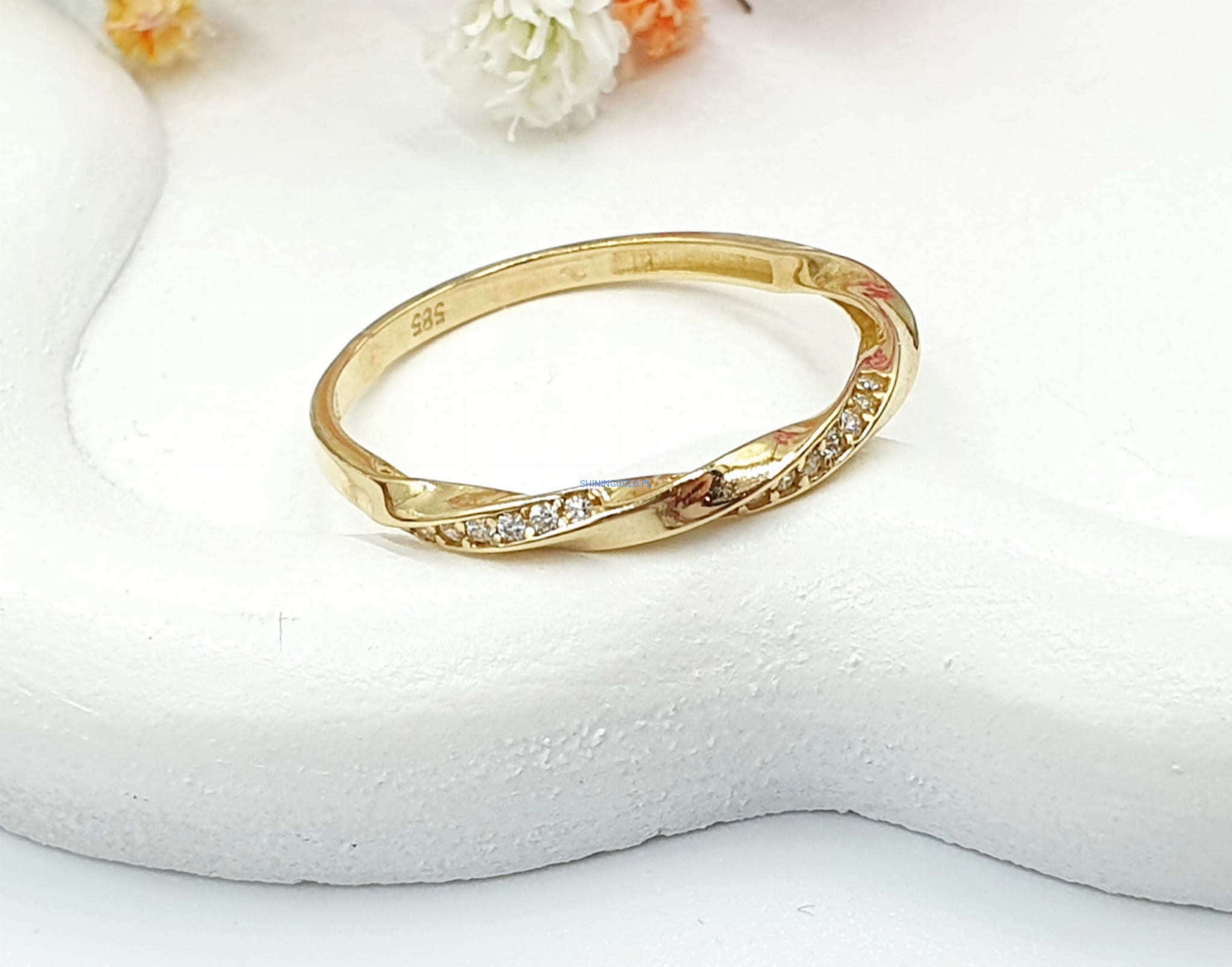 Ponadczasowy złoty pierścionek/obrączka próby 585 ozdobiony lśniącymi cyrkoniami, które nadają mu wyjątkowego blasku. Delikatny, ale efektowny design sprawia, że doskonale sprawdzi się jako stylowy dodatek na co dzień lub wyjątkowy prezent dla bliskiej osoby.