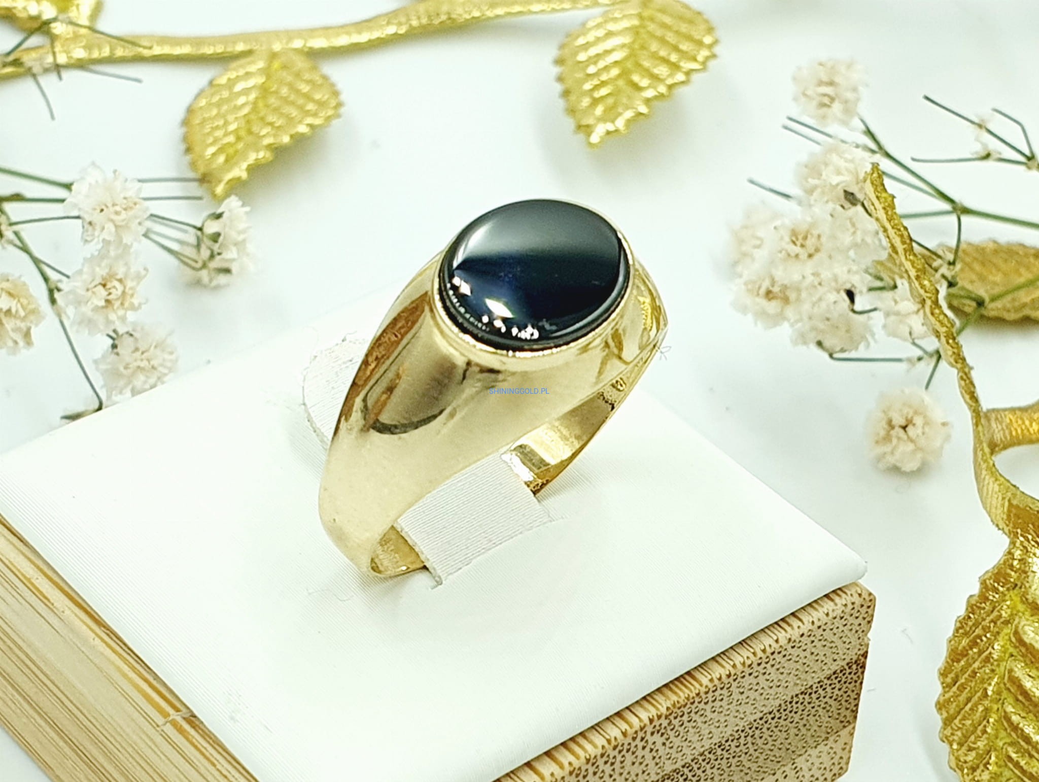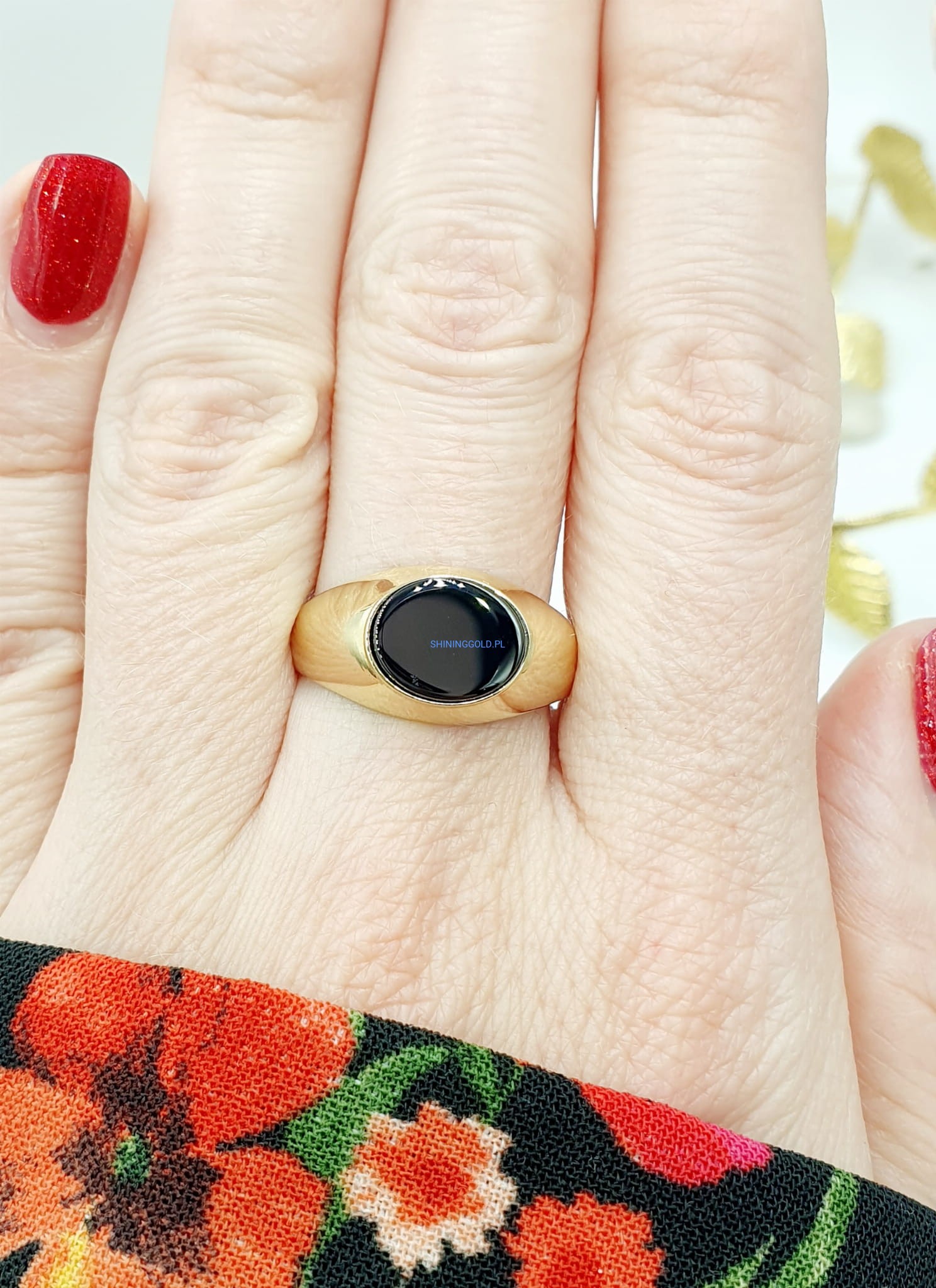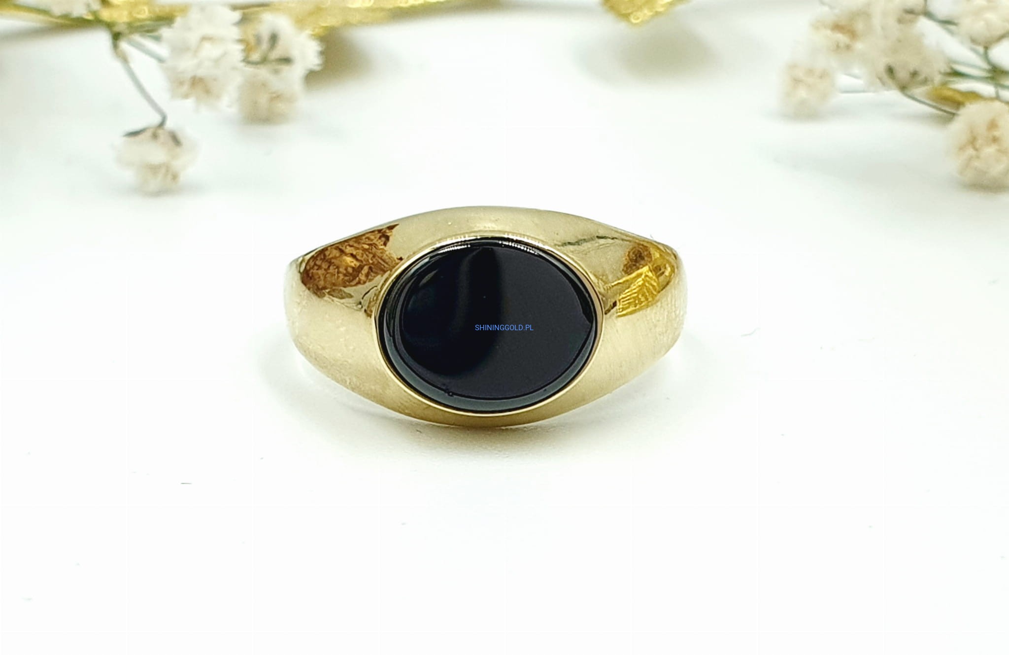 Złoty, elegancki sygnet z wyrazistym czarnym Onyksowym oczkiem, który podkreśla jego klasyczny i ponadczasowy charakter. Idealnie sprawdzi się jako wyrazisty dodatek do codziennych i formalnych stylizacji.