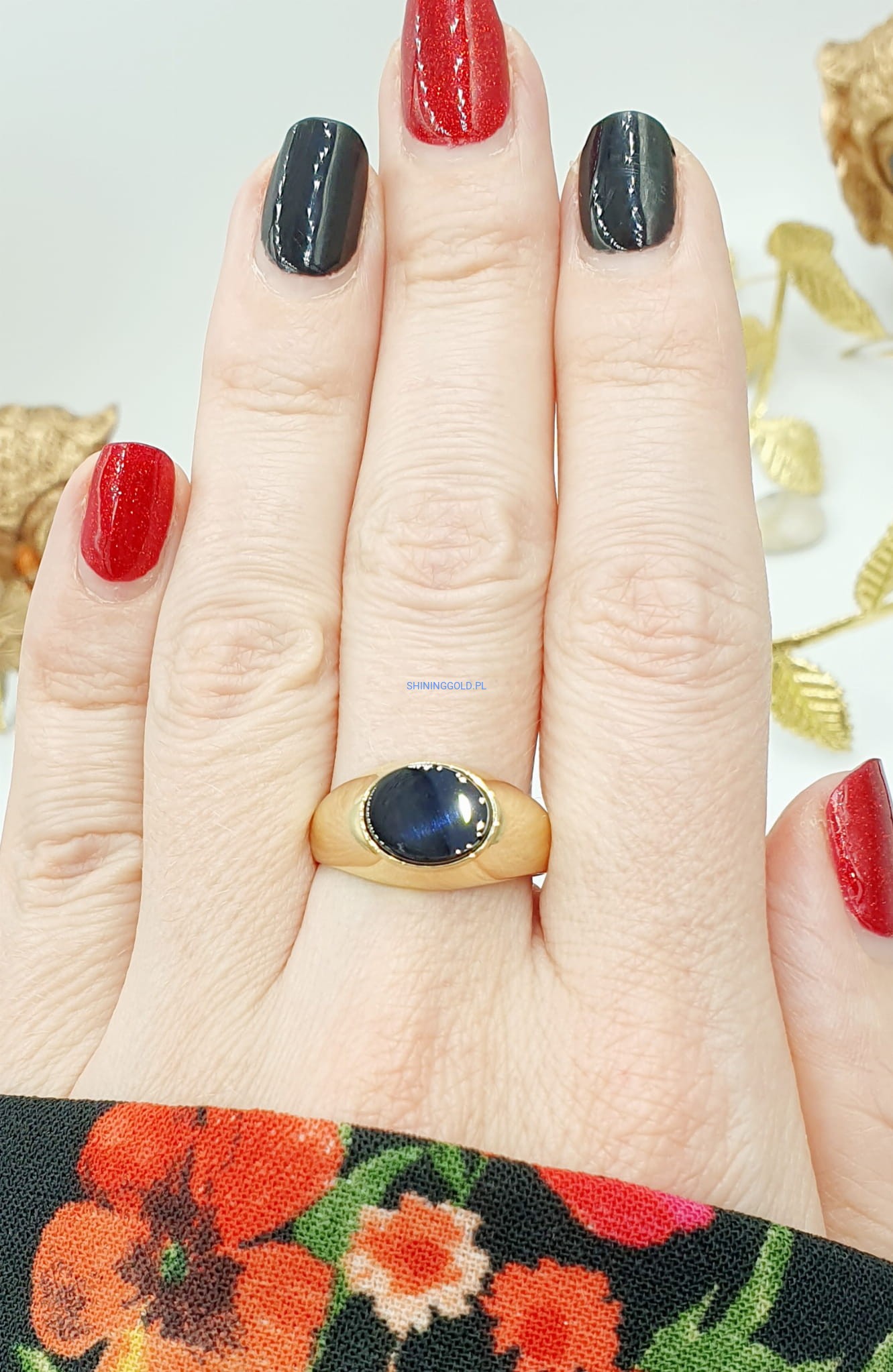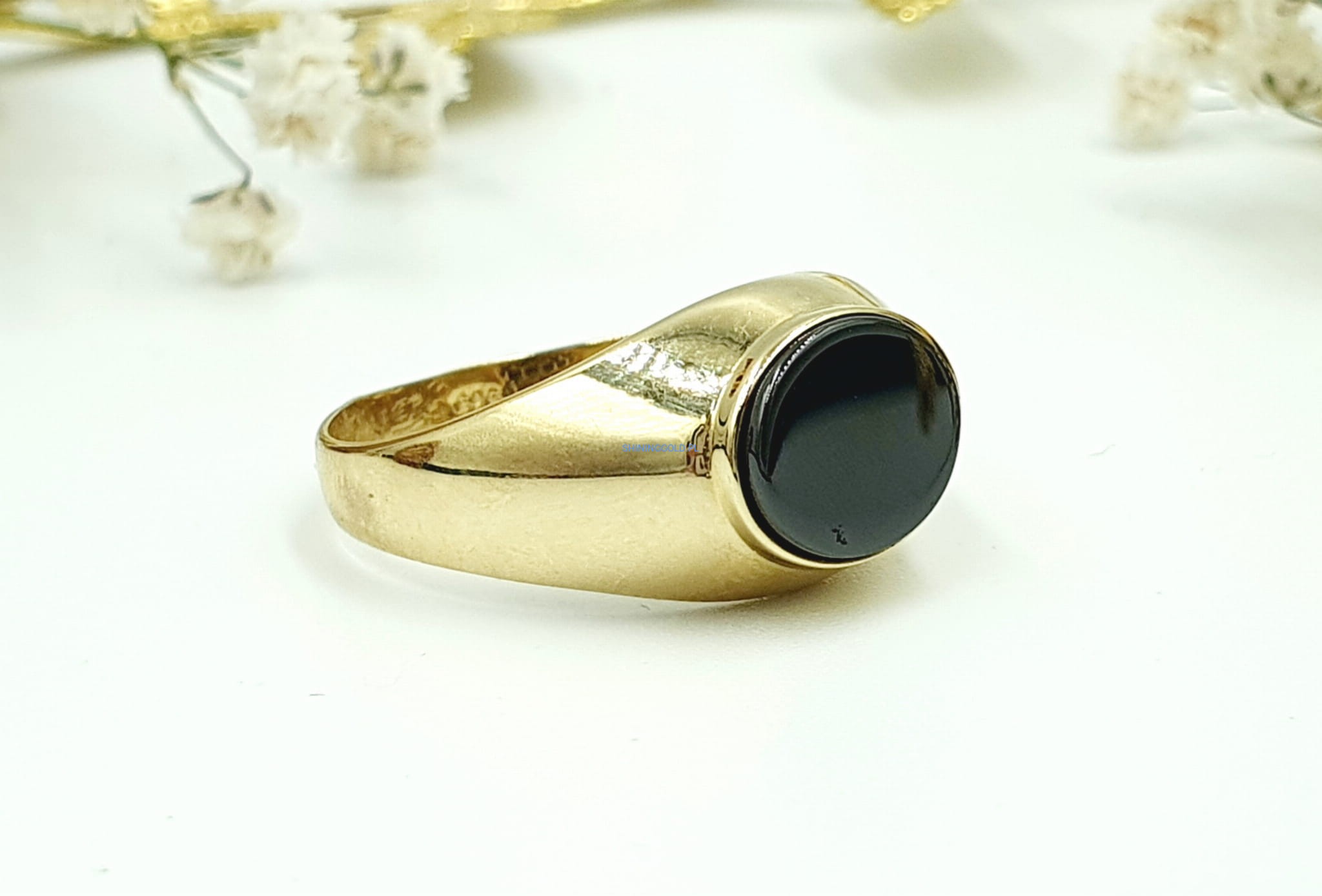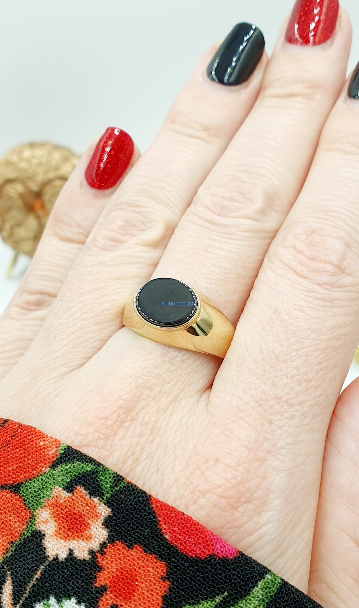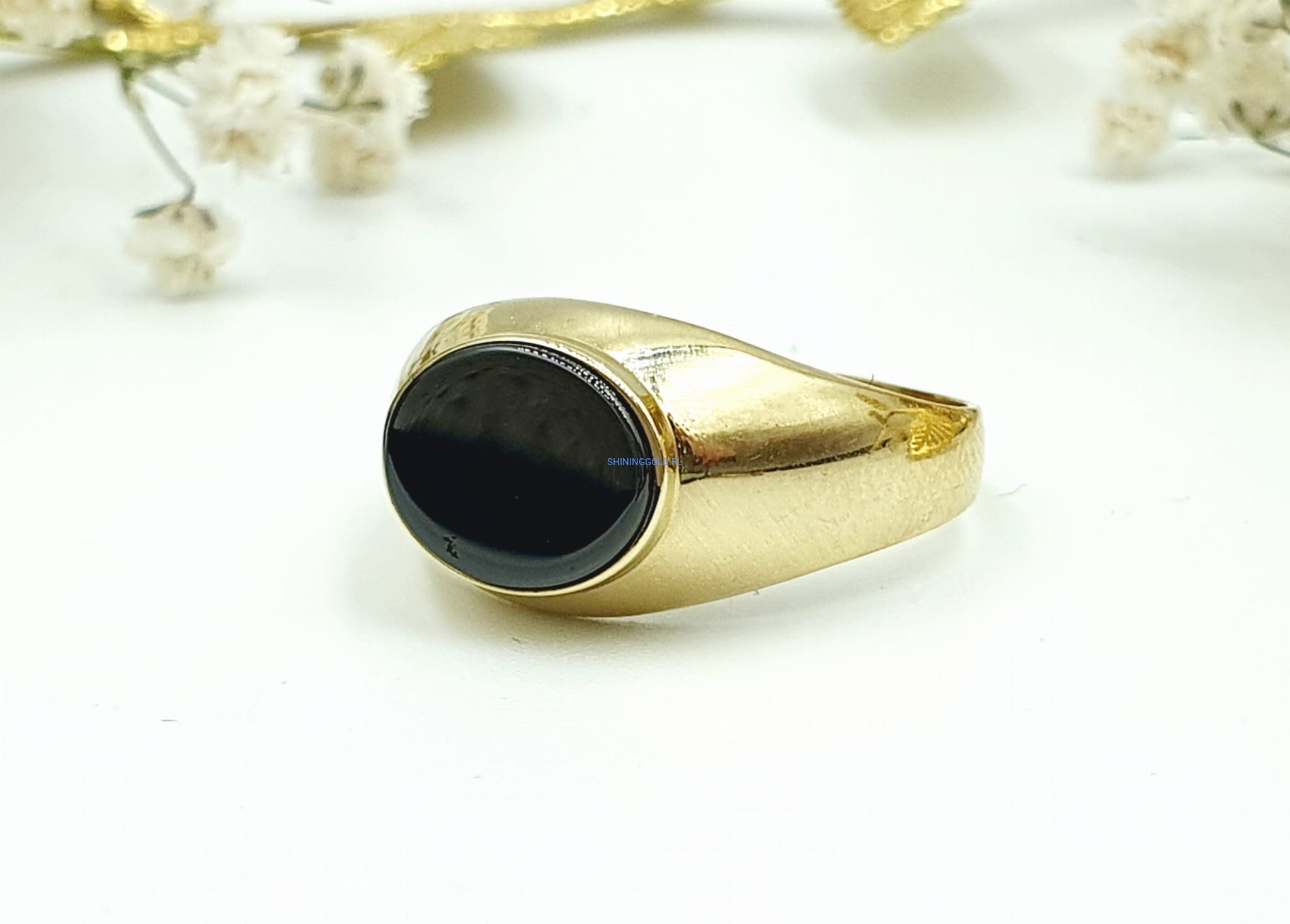Złoty, elegancki sygnet z wyrazistym czarnym Onyksowym oczkiem, który podkreśla jego klasyczny i ponadczasowy charakter. Idealnie sprawdzi się jako wyrazisty dodatek do codziennych i formalnych stylizacji.