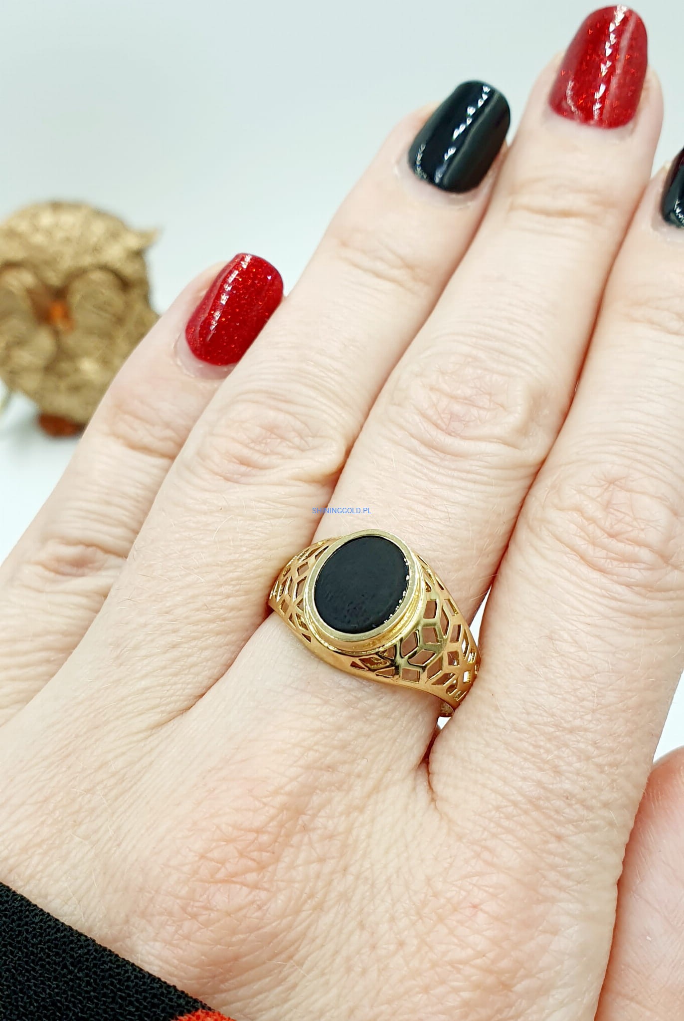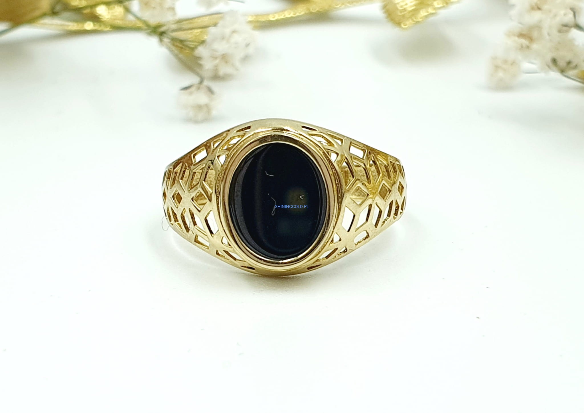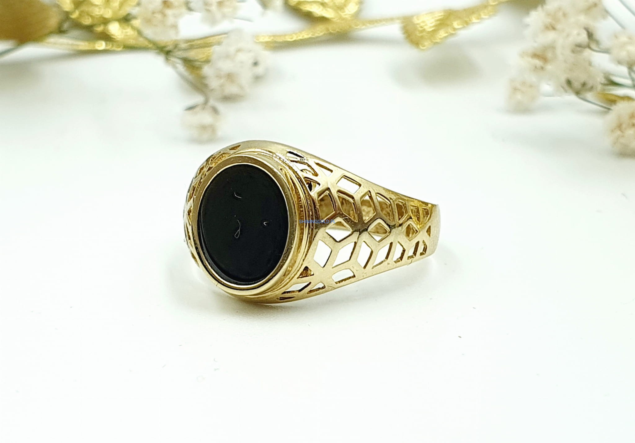Złoty ażurowy sygnet z Onyksem