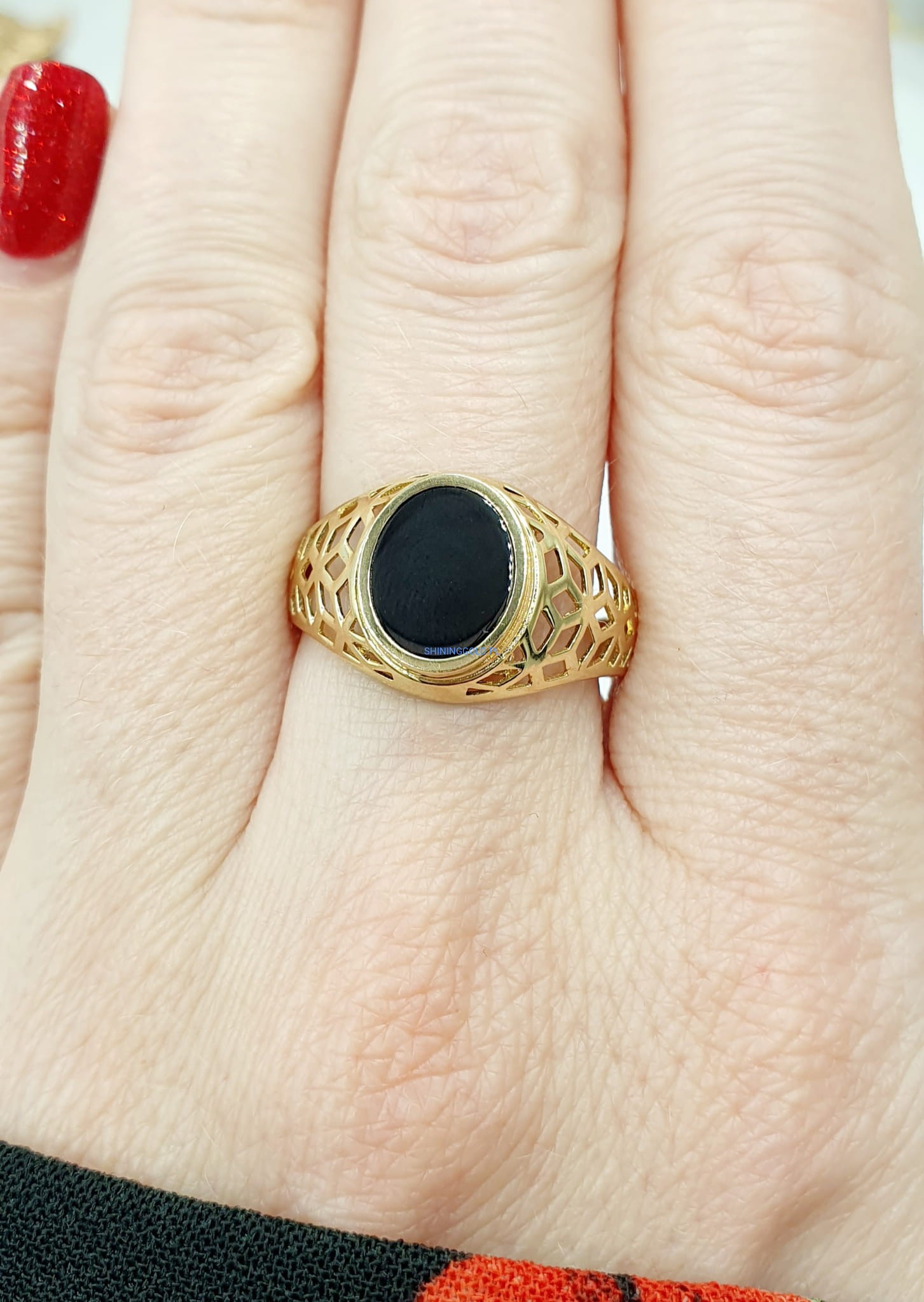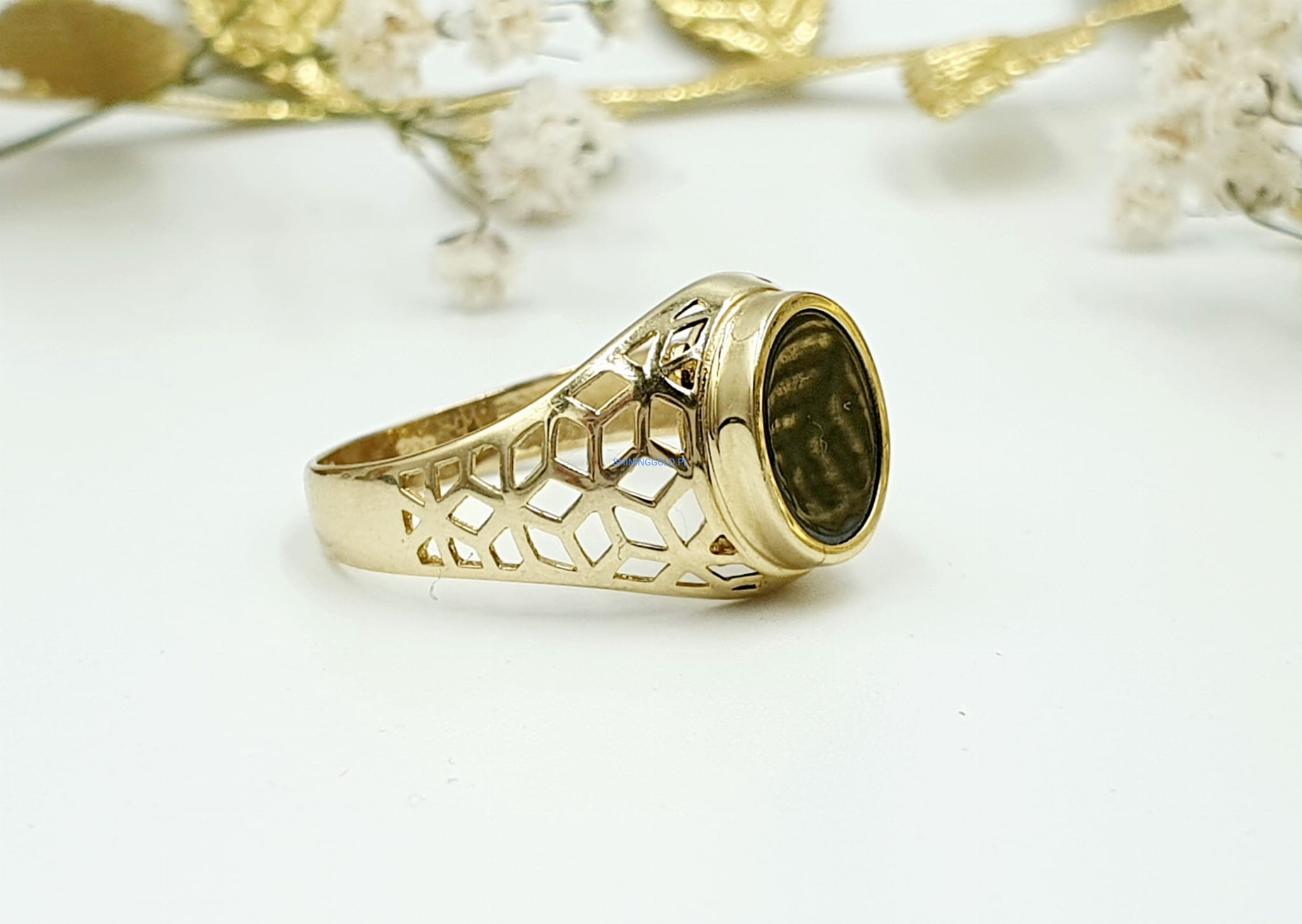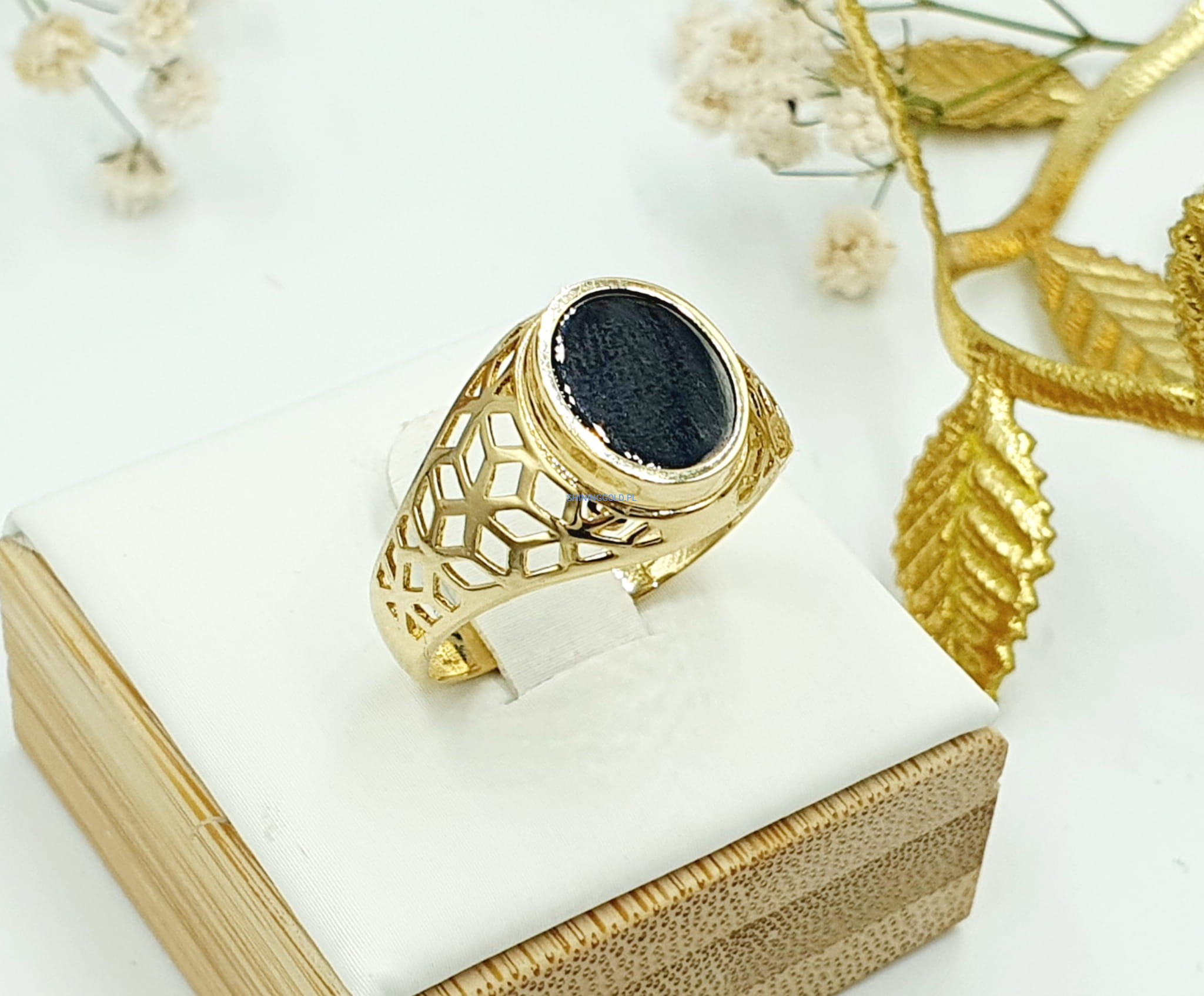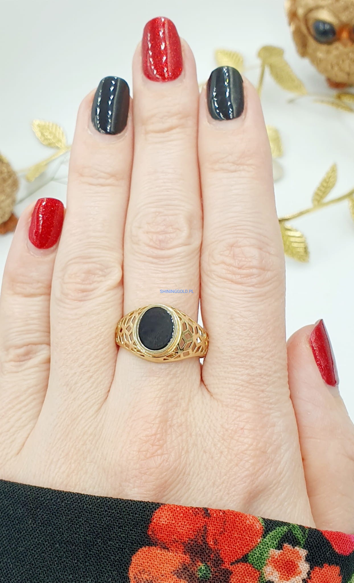 Złoty ażurowy sygnet z Onyksem