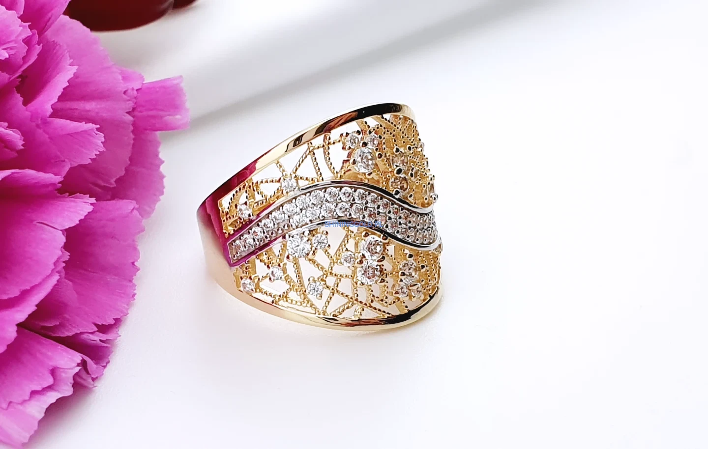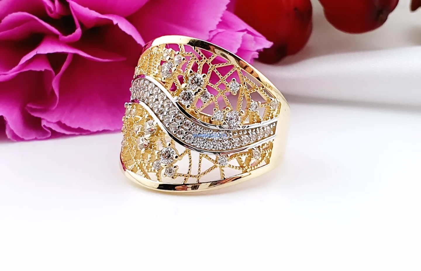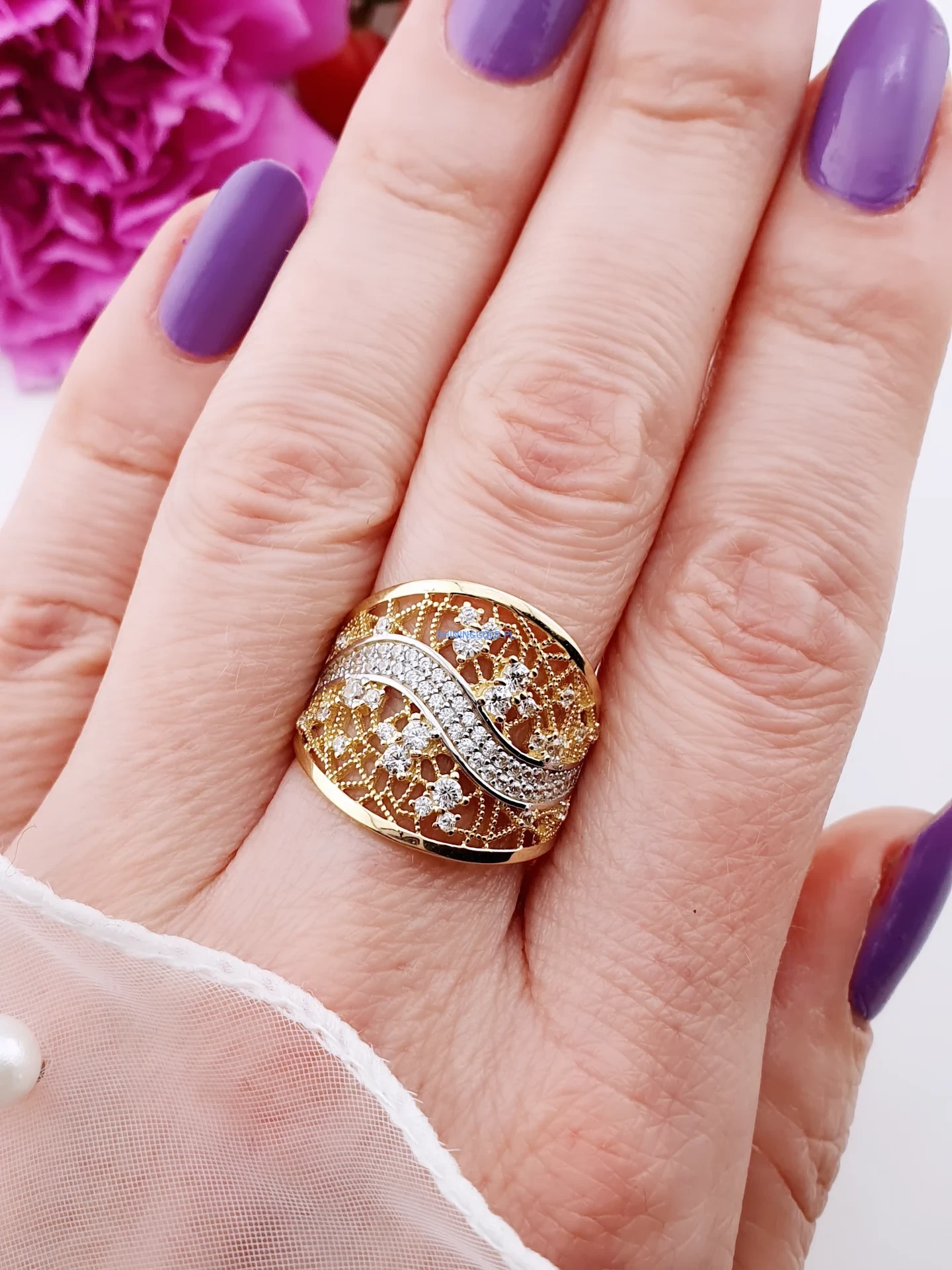 Złoty, nowy pierścionek z cyrkoniami – ażurowy (021A)