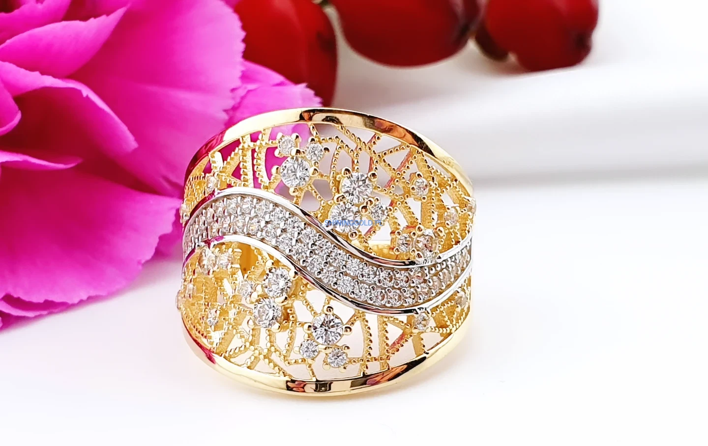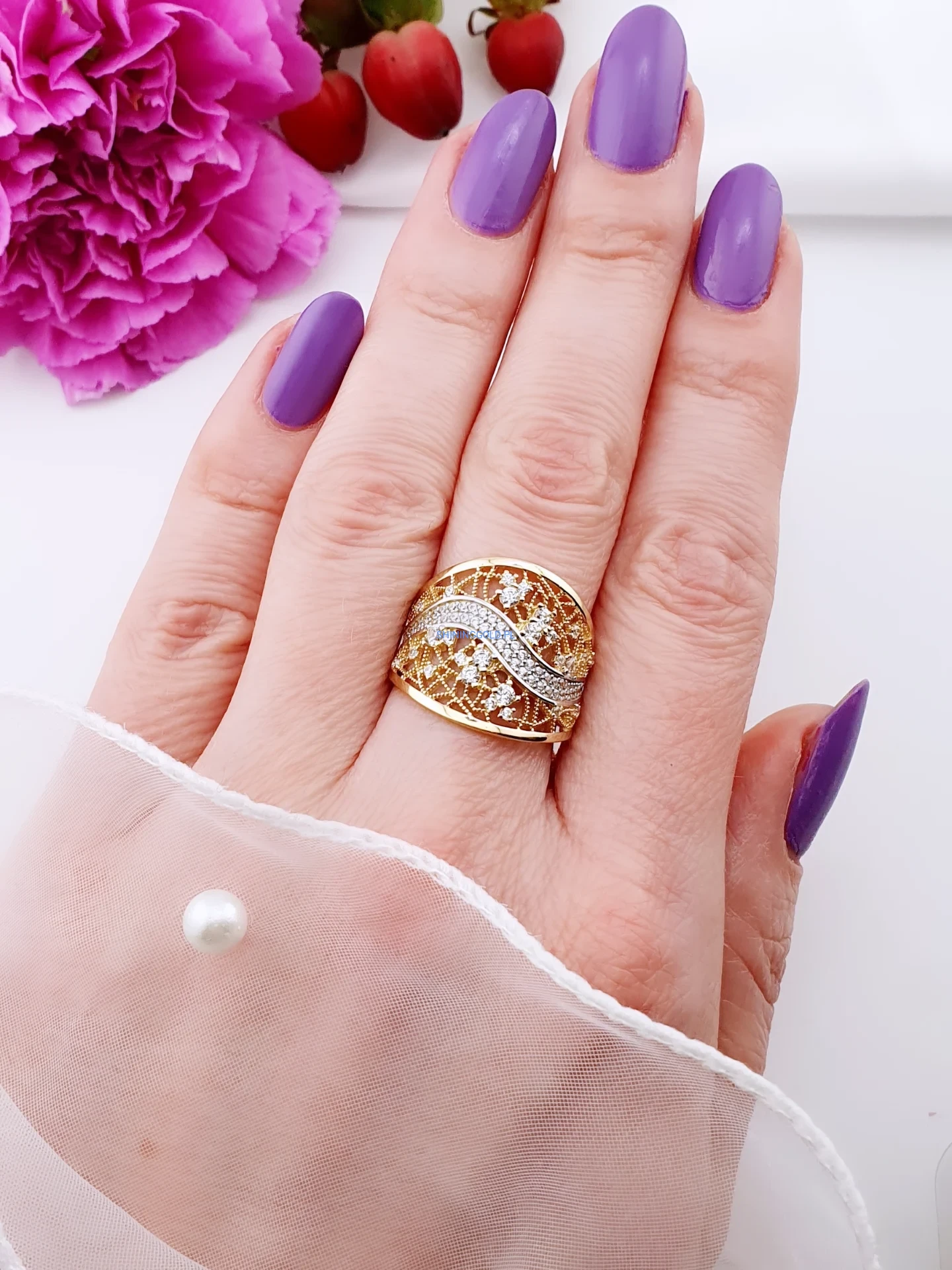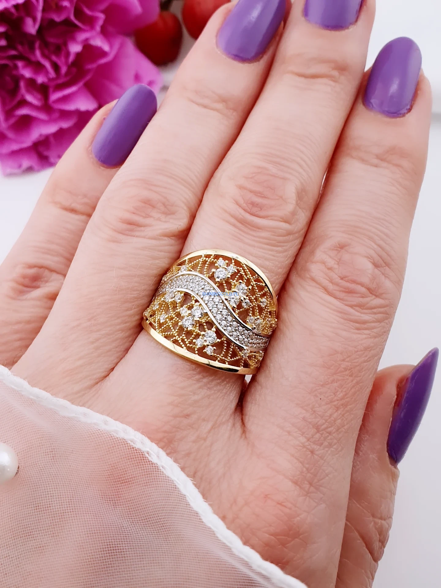 Złoty, nowy pierścionek z cyrkoniami – ażurowy (021A)